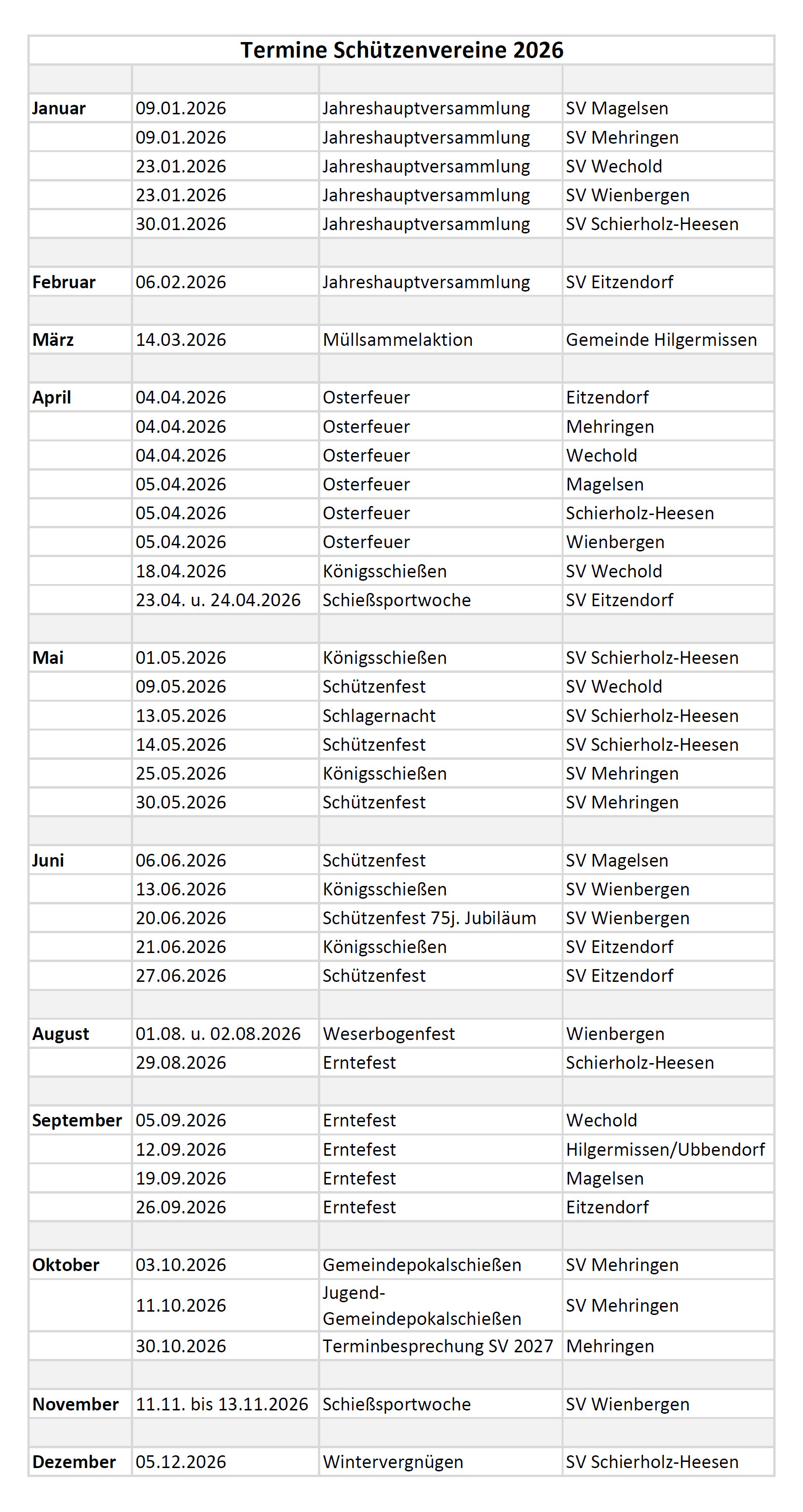 Die Gemeinde Hilgermissen (der Gemeinderat) wird für das Jahr 2026 (wie schon 2024 u. 2025) leider keine gedruckte Version eines Veranstaltungskalenders mehr auflegen (der Aufwand sei zu hoch).
