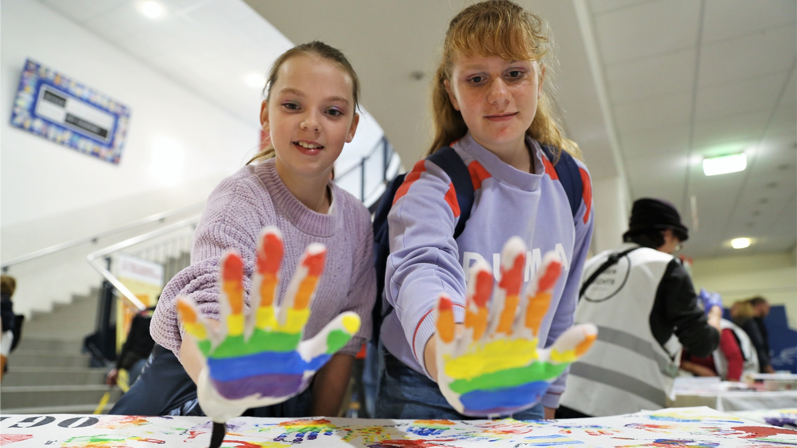 Bild: Liv Hüneke aus Bücken und Eva Ziemer aus Buchhorst haben beim Festival Get Loud against Hate mit ihrem Handabdruck ein Zeichen für Vielfalt gesetzt. Jetzt gibt es in Hoya eine Fotoaktion, an der sich auch die Festival-Organisatoren beteiligen.