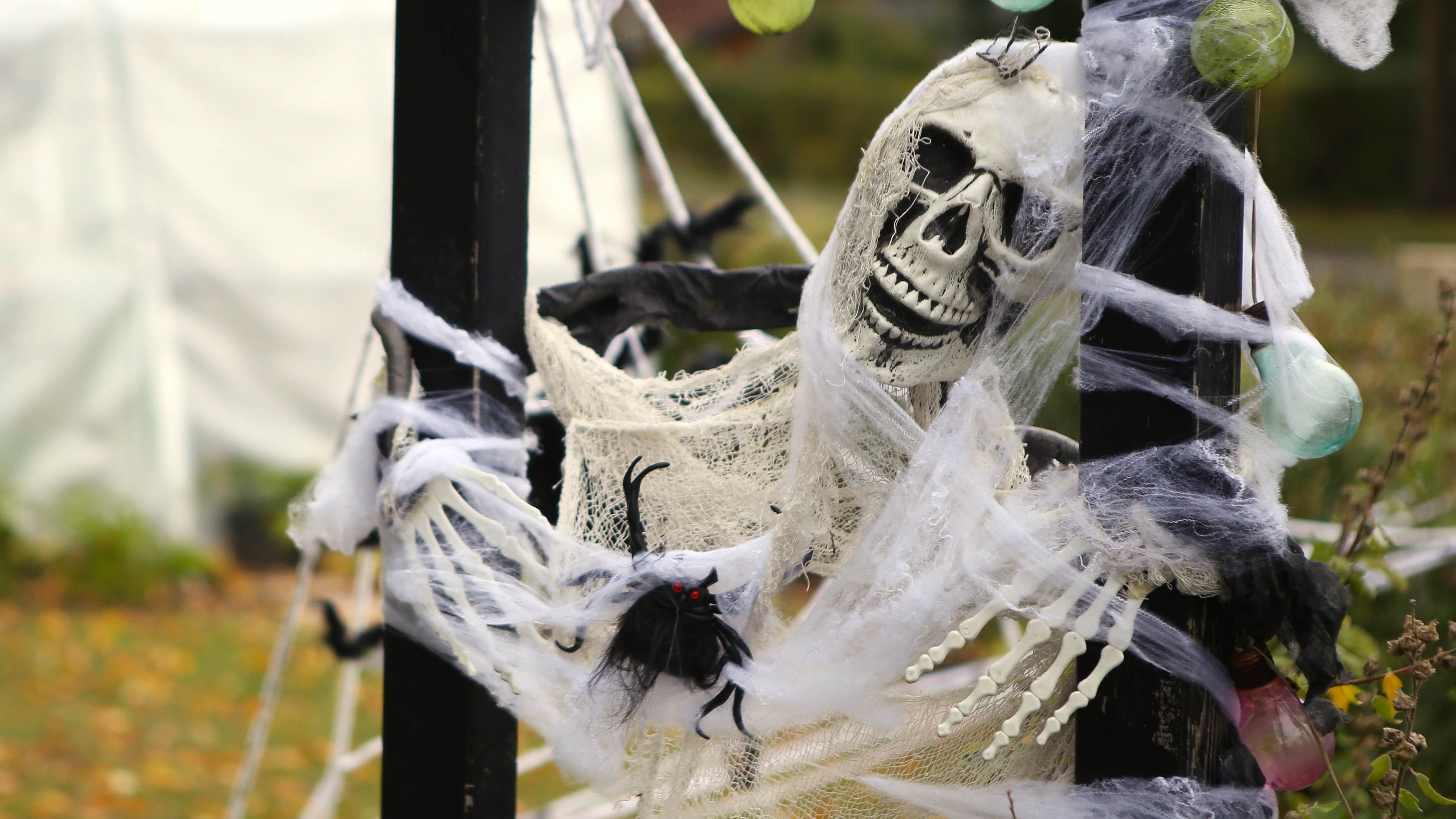 Bild: Skelette und Spinnennetze schmücken den Garten von Janet Schendel alias Frau Silberfisch in Oyle.