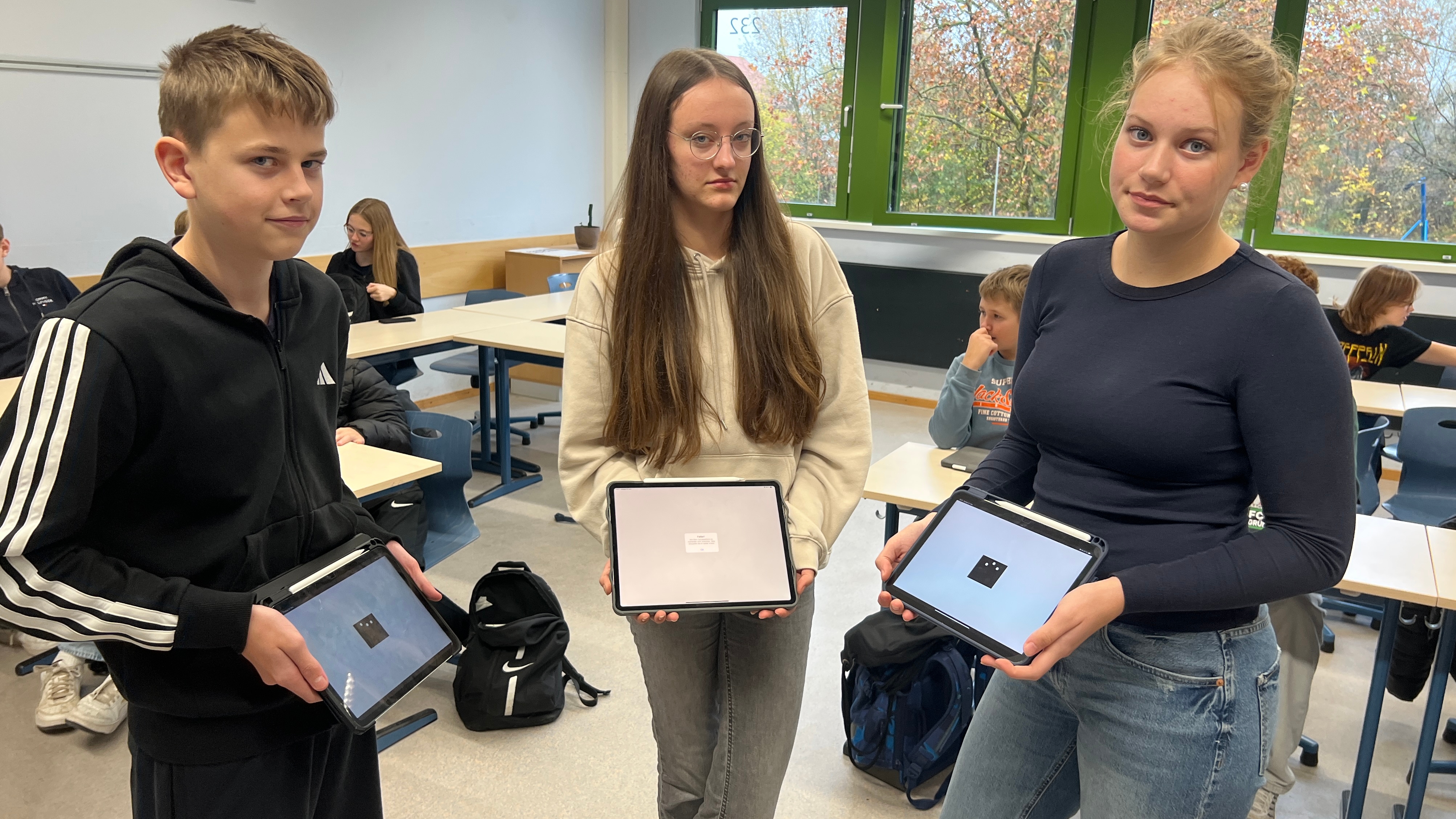 Bild: Keine Verbindung ins Internet: Die Neuntklässler Ian Schmidt, Teresa Stahlhut und Marit Zurheide (von links) können ihre Tablets nicht nutzen.