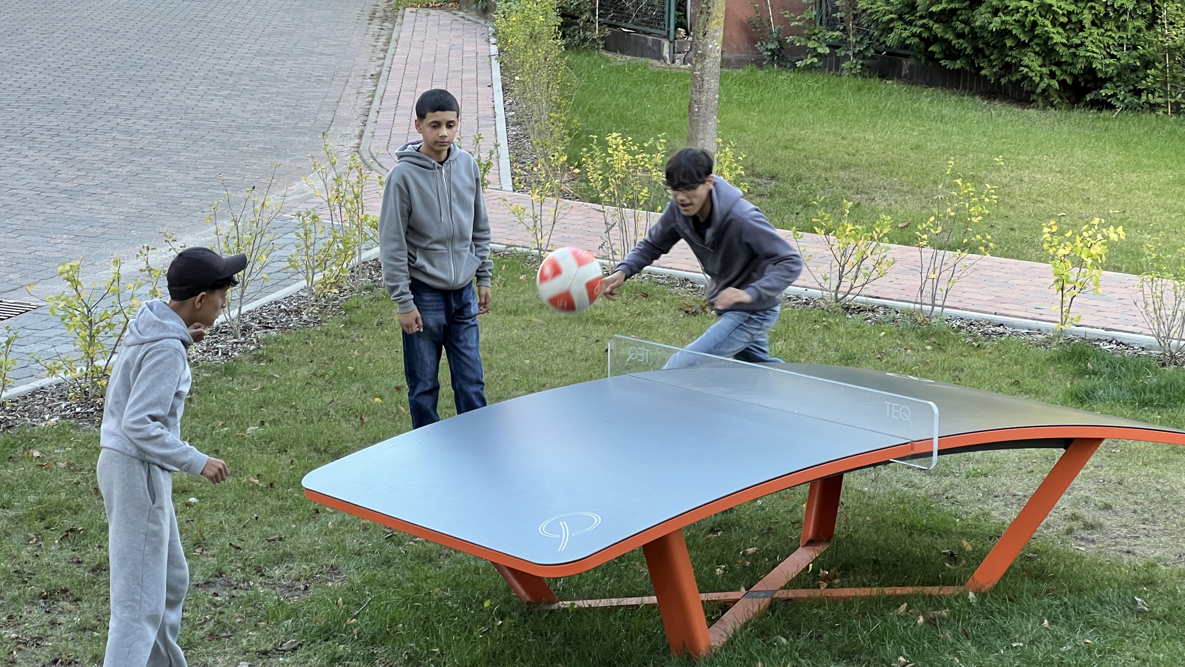 Bild: Eine Teqball-Platte steht jetzt auf einer der wenigen kleinen Grünflächen vor dem Gebäude.