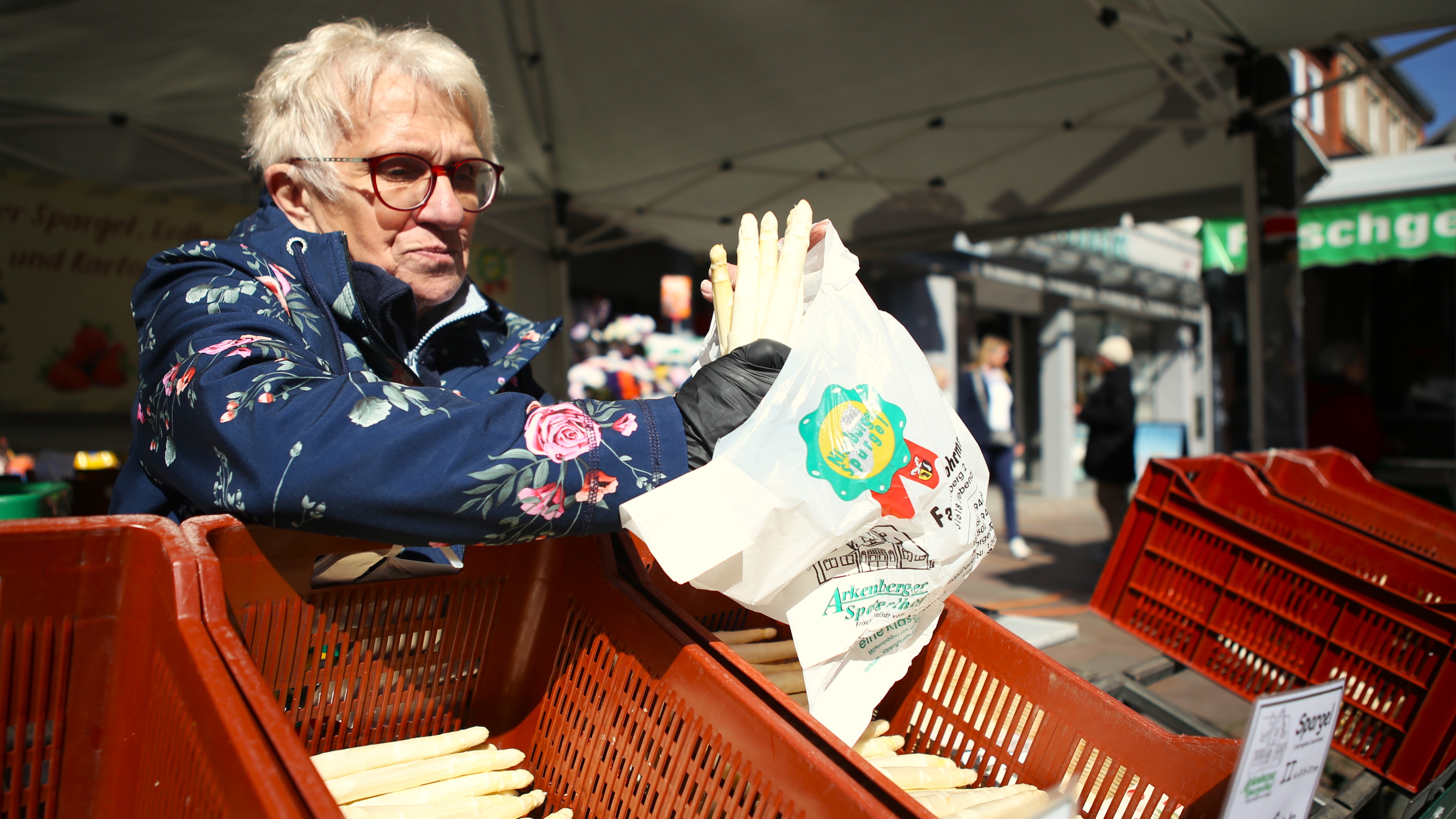 Bild: Christa Fischer verkauft für den Hof Arkenberg Spargel auf dem Wochenmarkt in Nienburg.