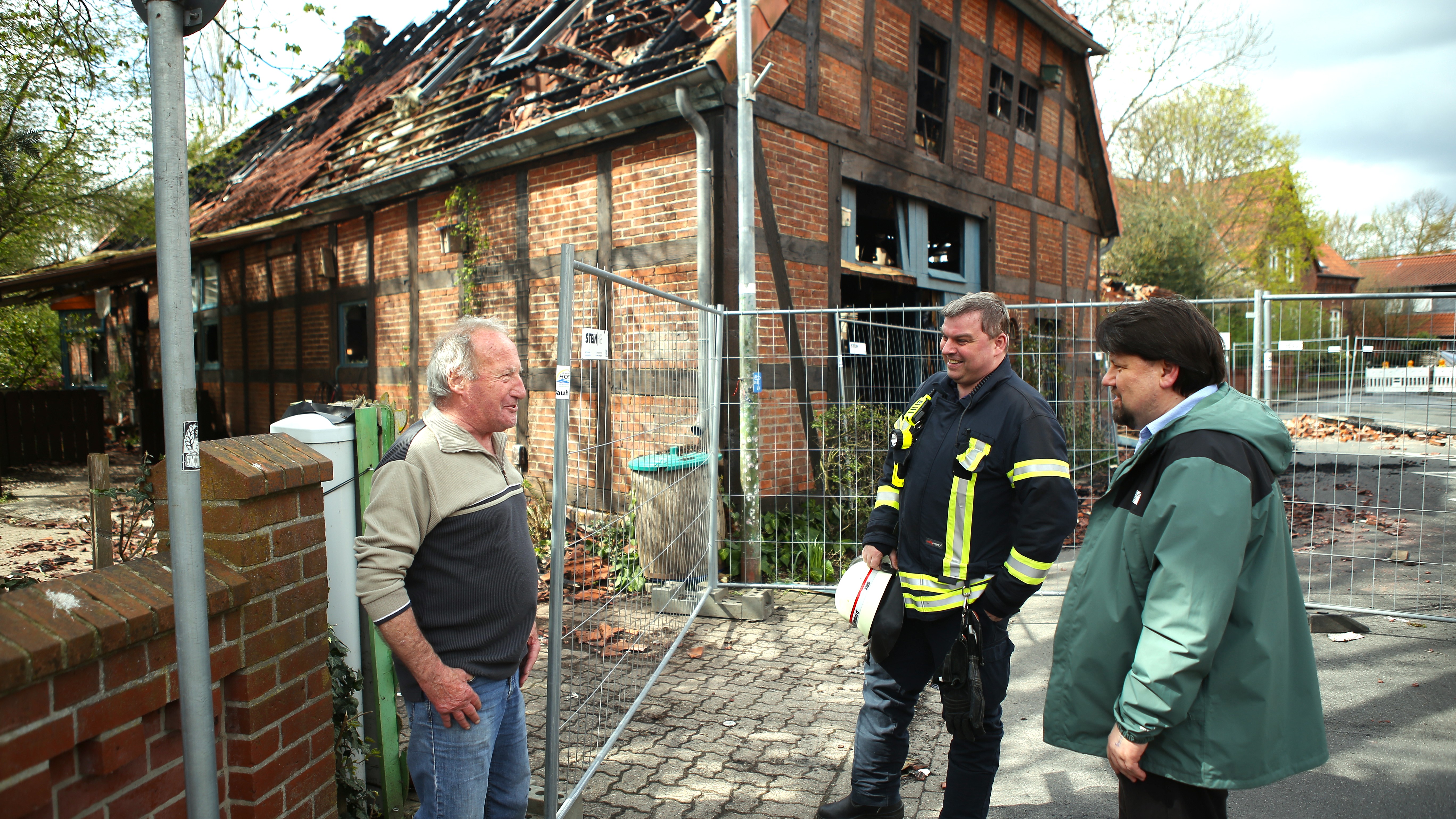 Bild: Brandopfer Paul Schürmann (links) hat das Lachen nicht verloren: Im Gespräch mit Feuerwehr-Einsatzleiter Jan Schumacher (Mitte) und Pastor David M. Peter drückt der 81-Jährige seine Freude über die vielen Spenden nach dem Feuer aus.
