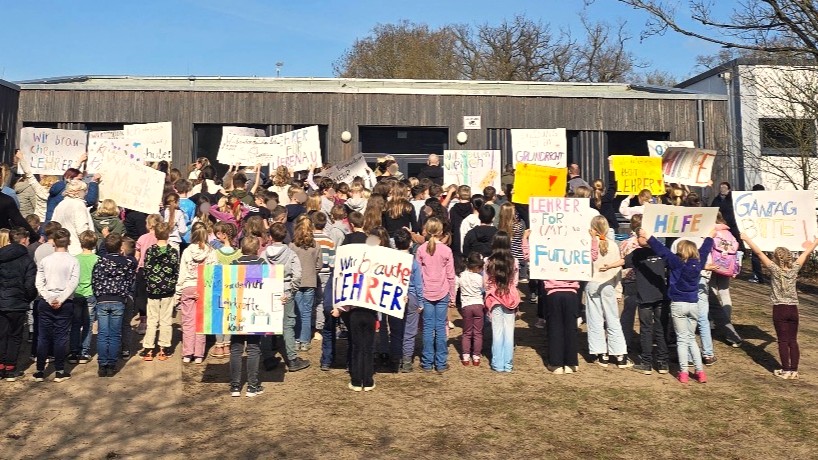 Bild: Eltern und Kinder der Grundschule in Liebenau protestieren gegen den Lehrermangel.