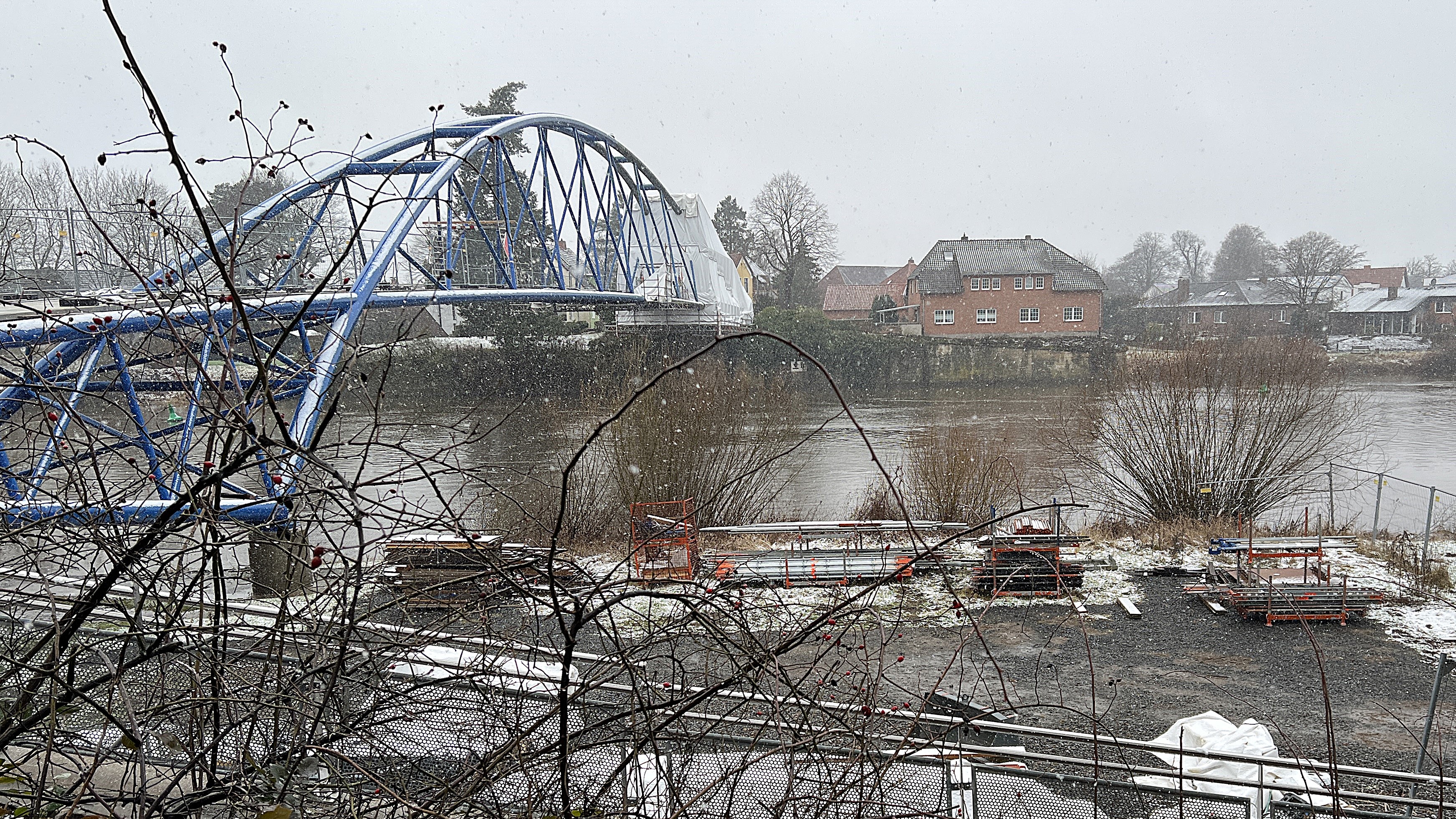 Bild: Auf diesem Grundstück, wo momentan die Sanierungsarbeiten der Wesertorbrücke laufen, könnte es einen Schiffsanleger geben.