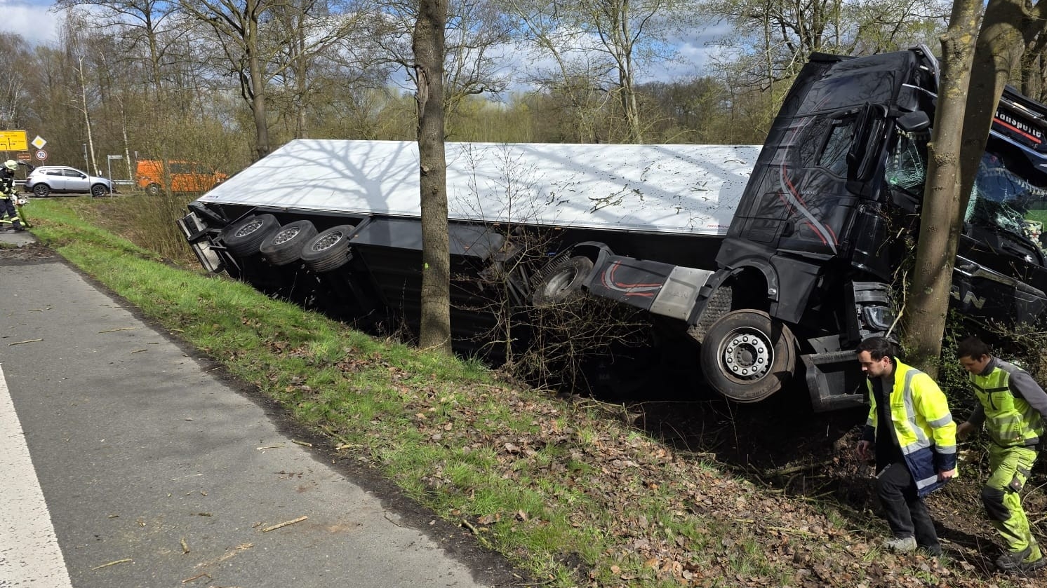 Bild: Ein Lkw steht auf der B215 zwischen Nienburg-Schäferhof und Leeseringen quer. Die Bundesstraße ist voll gesperrt.