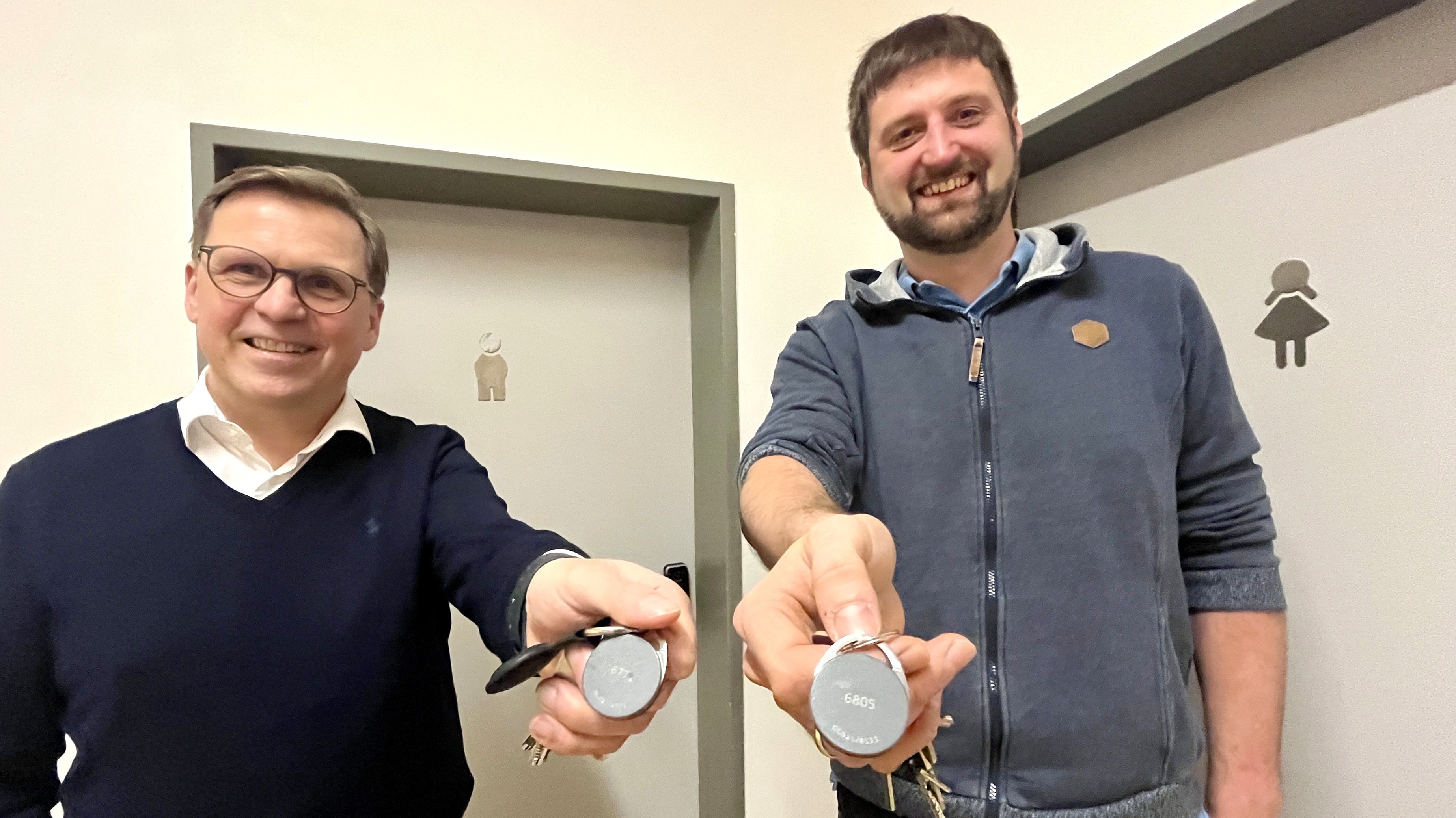 Bild: MDG-Schulleiter Lutz Kulze-Meyer (links) und Initiator Martin Reuss hoffen, dass das neue Transpondersystem Wirkung auf den Dönhoff-Toiletten zeigt.