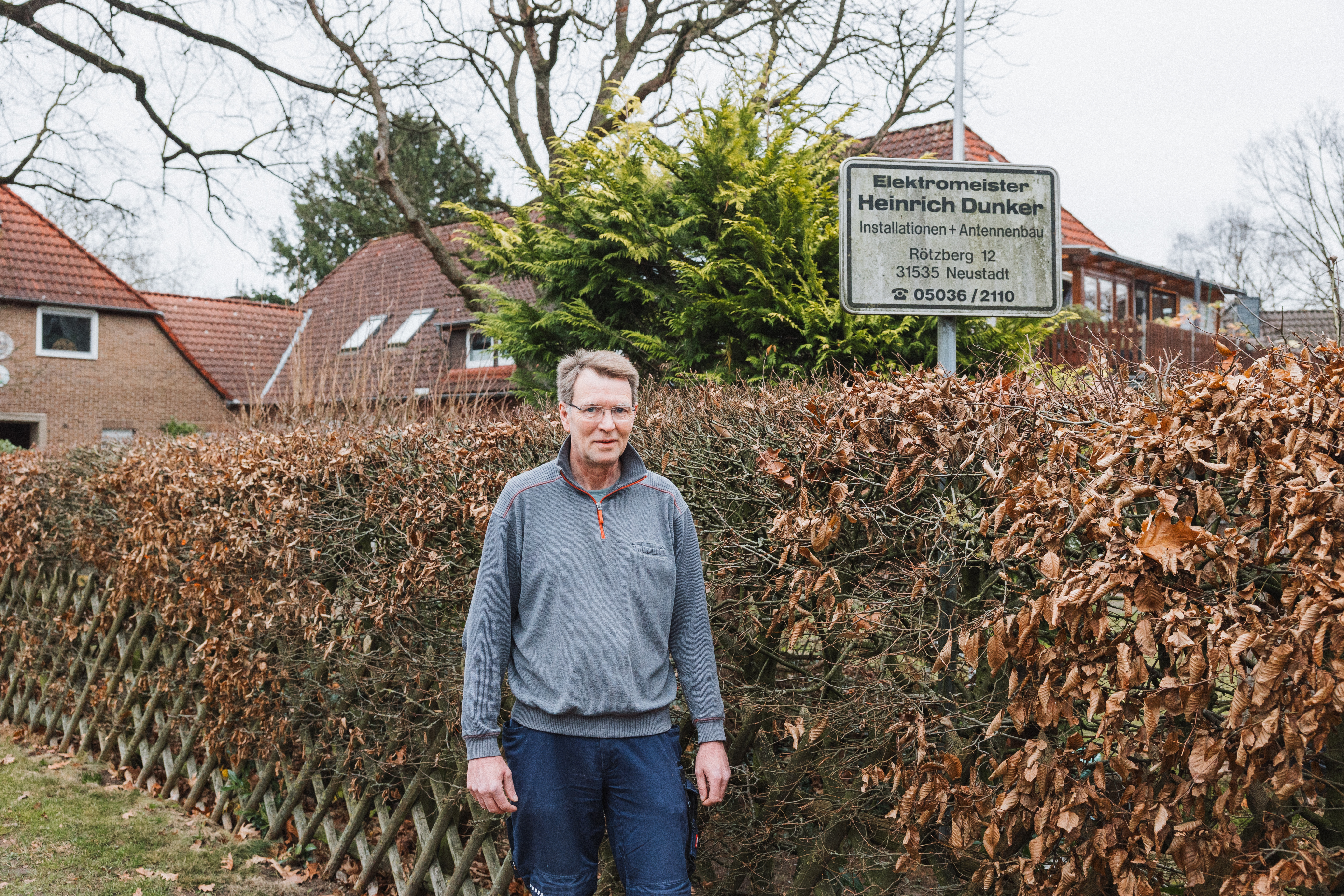 Bild: Unter seinem alten Werbeschild mit bisheriger Postleitzahl 31535: Heinrich Dunker, Elektriker in Schneeren.