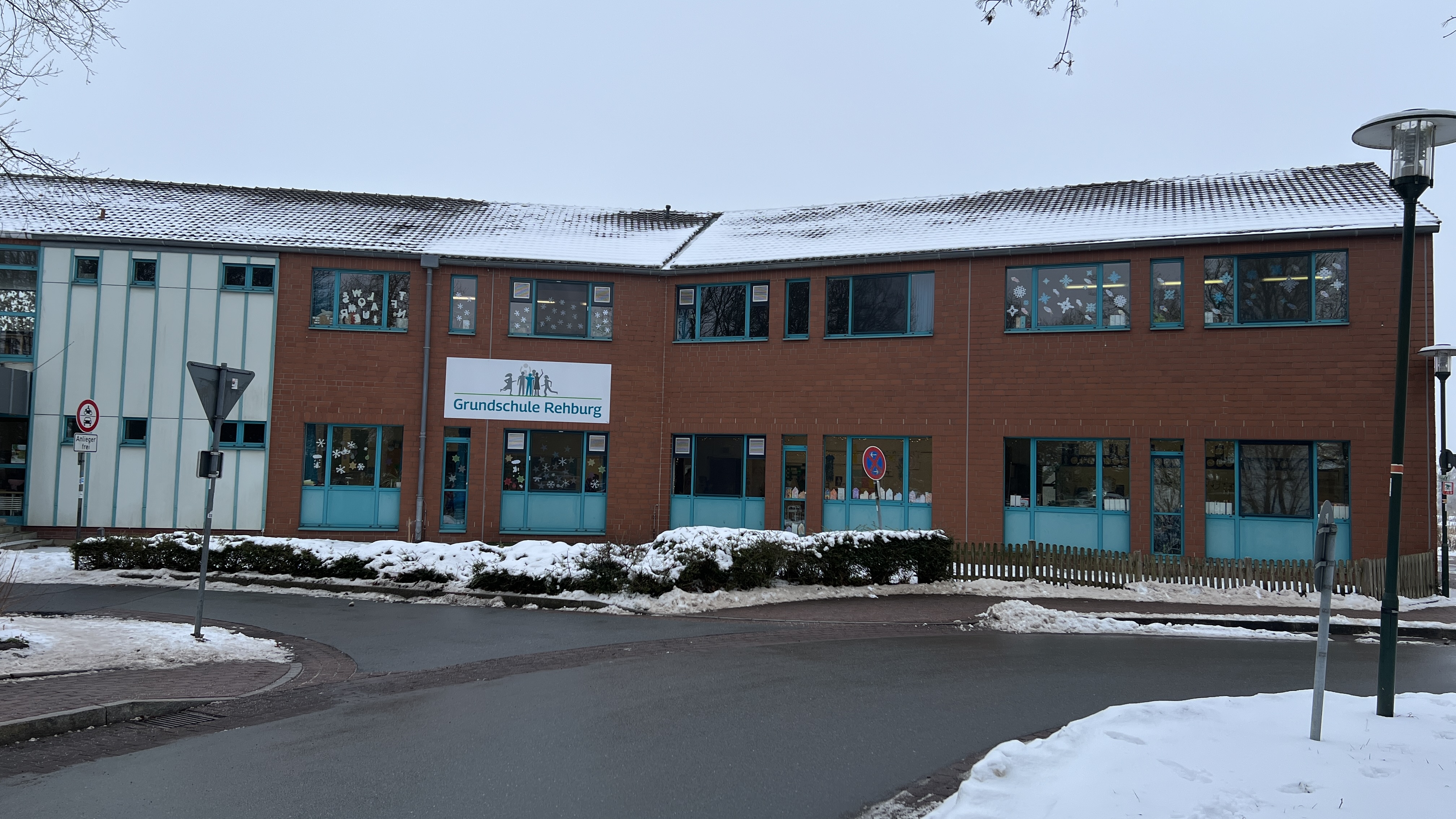 Bild: An der Grundschule in Rehburg wird ein Neubau in Modulbauweise errichtet. Aus dieser Perspektive wird er links vom Eingang errichtet werden.