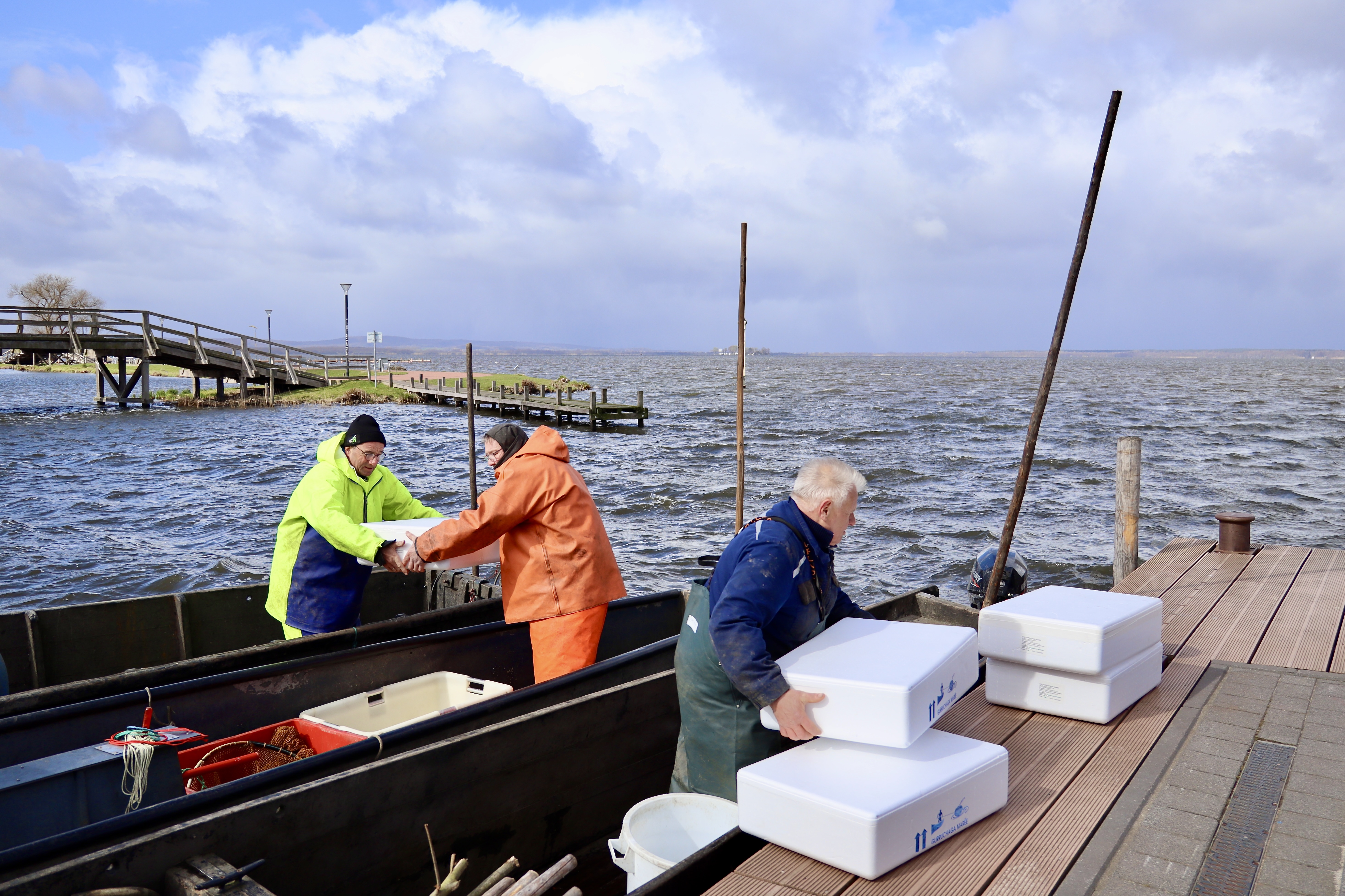 Bild: Viele Hände, schnelles Ende: Uli Balzer, Heinz Schweer und Detlef Hodann verladen die Glasaale in ihre Boote, um die Jungfische an unterschiedlichen Stellen im Steinhuder Meer auszusetzen.