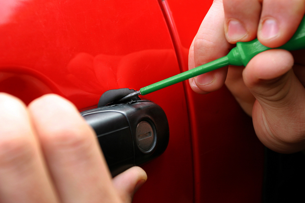 Bild: Eine Autotür wird mit Hilfe eines Schraubenziehers geöffnet (Symbolbild).