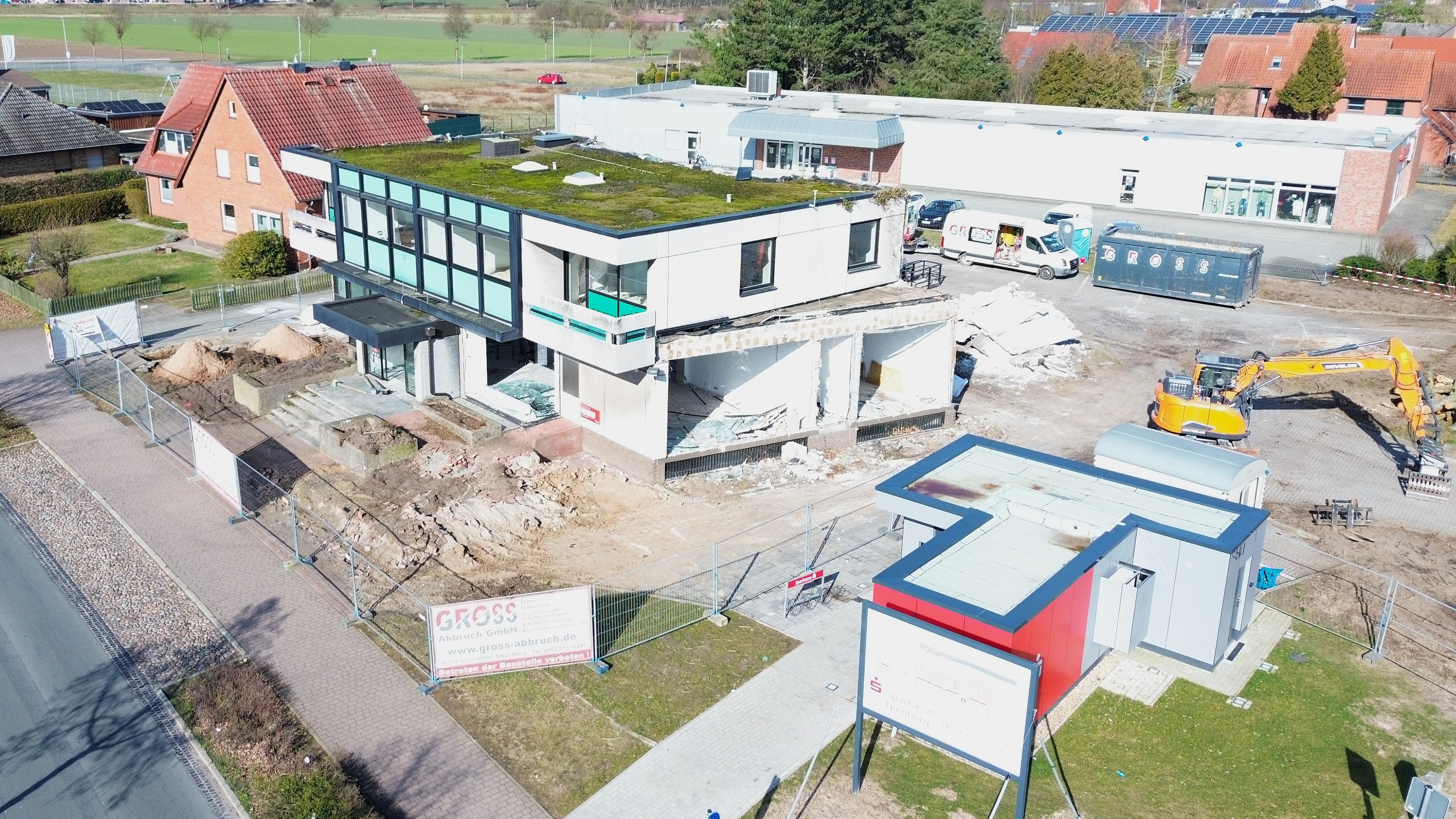 Lemke – Bagger des Abbruchunternehmens Gross reißen die alte Sparkasse in Lemke ab. Nach dem Abriss soll dort ein Neubau entstehen. Neben der Sparkasse soll dieser Platz für eine zweite Gewerbeeinheit und Wohnungen bieten.
