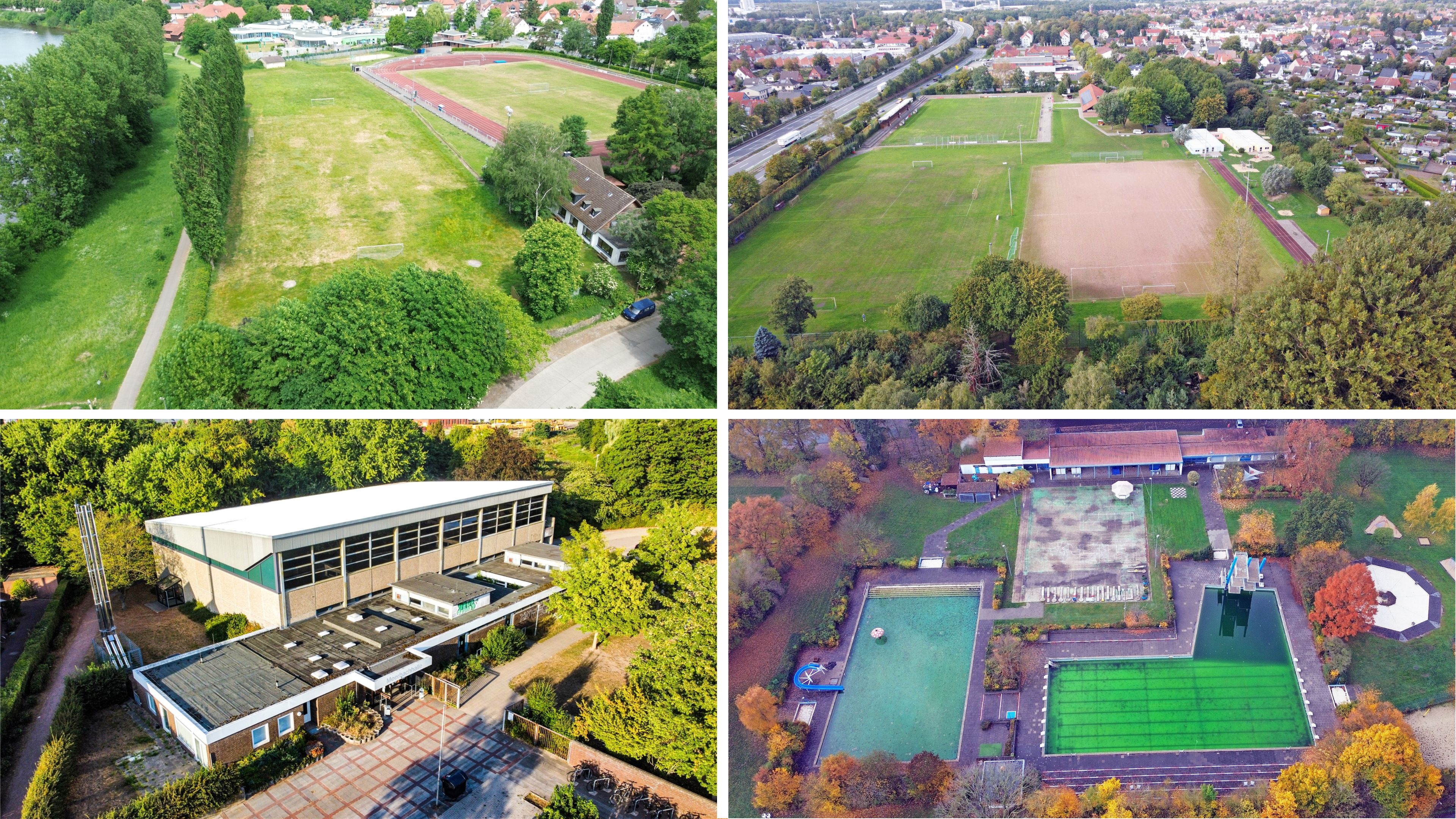 Bild: Das Stadion an der Mindener Landstraße, das Stadion in der Mußriede, das Holtorfer Freibad und die Meerbachhalle (im Uhrzeigersinn) könnten für eine Förderung infrage kommen.