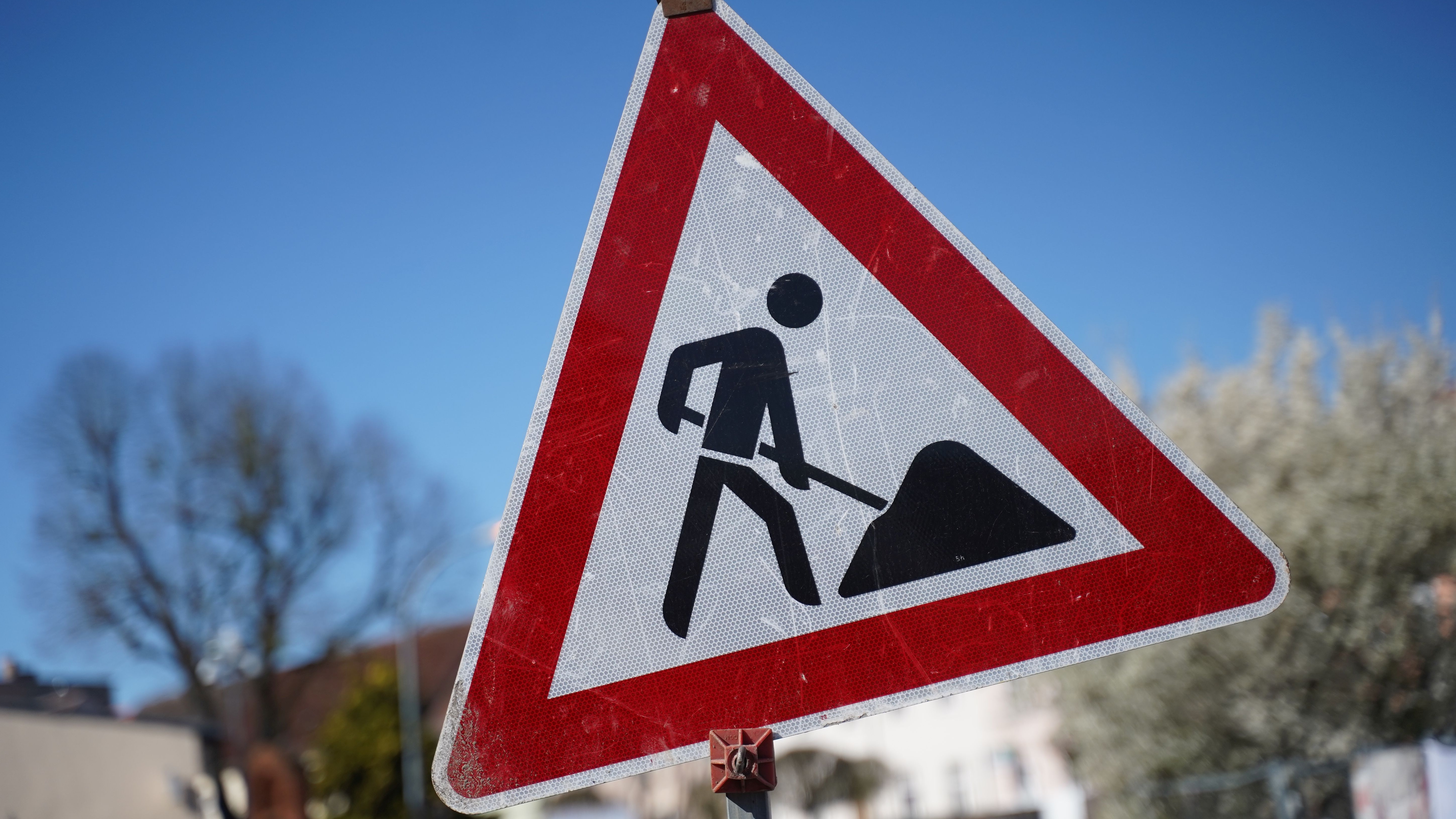 Bild: Ein Schild warnt Autofahrer vor den Bauarbeiten in der Steinstraße von Neuruppin.