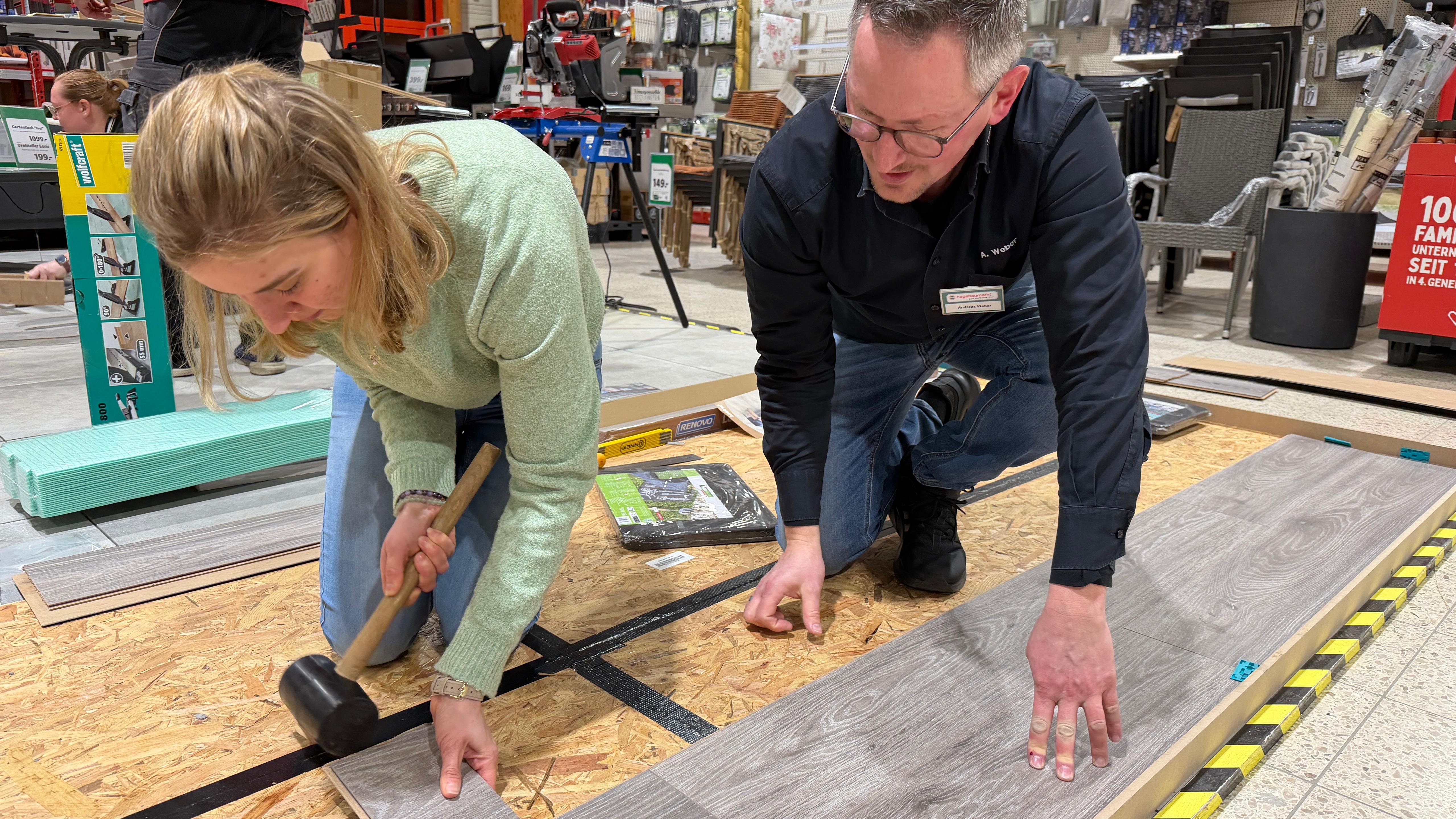 Bild: Filialleiter Andreas Weber erklärt, wie Bodenbelag verlegt wird.