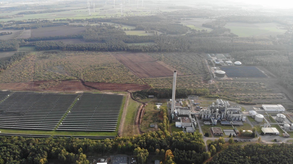 Bild: Die Oxxynova und das Gelände des künftigen "GreenTec Parks" in Steyerberg aus der Luft.