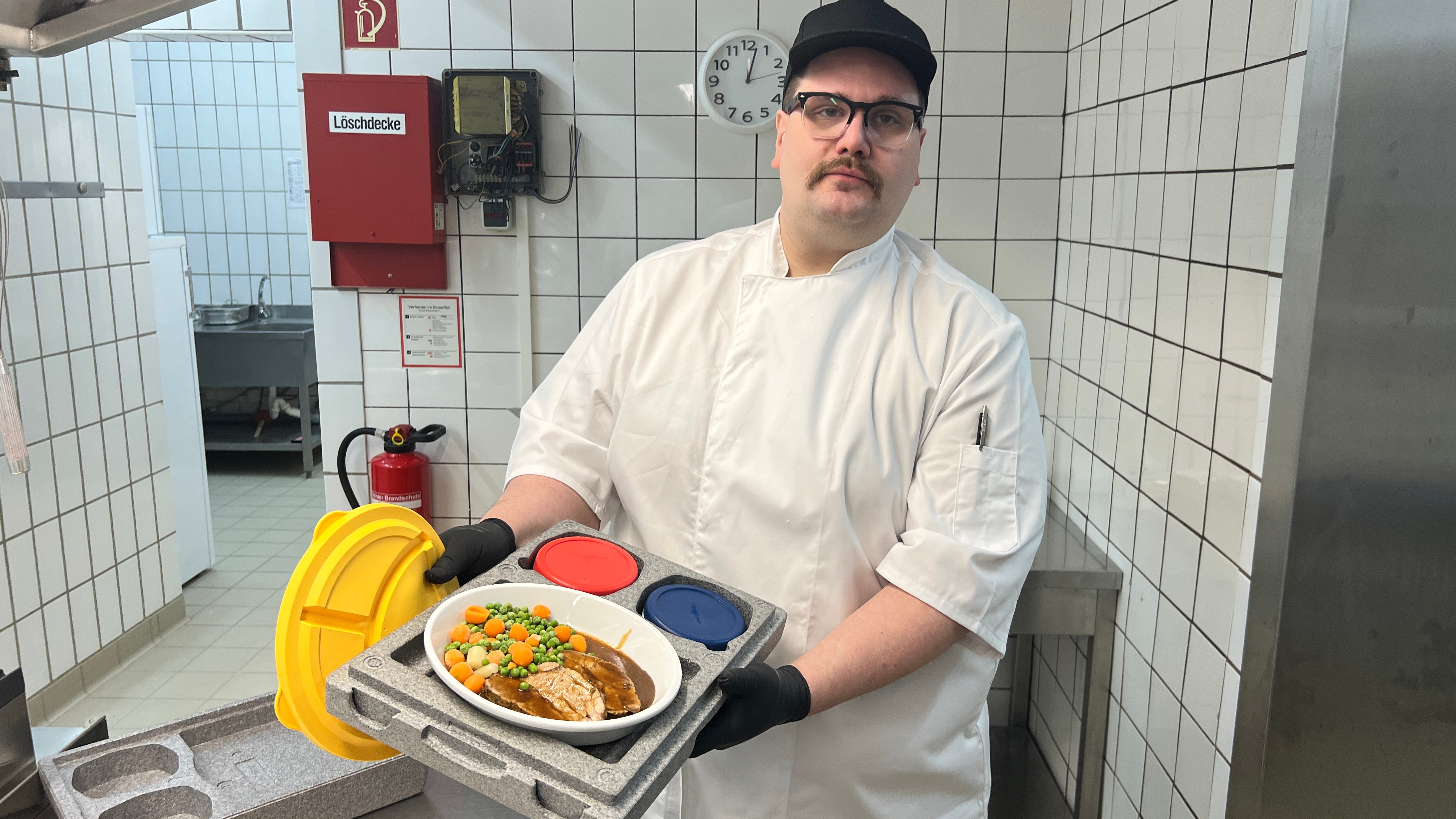 Bild: Essen aus Porzellangeschirr mit Deckeln: Koch Mike Kuhlmann serviert deftigen Schweinebraten mit Gemüse.