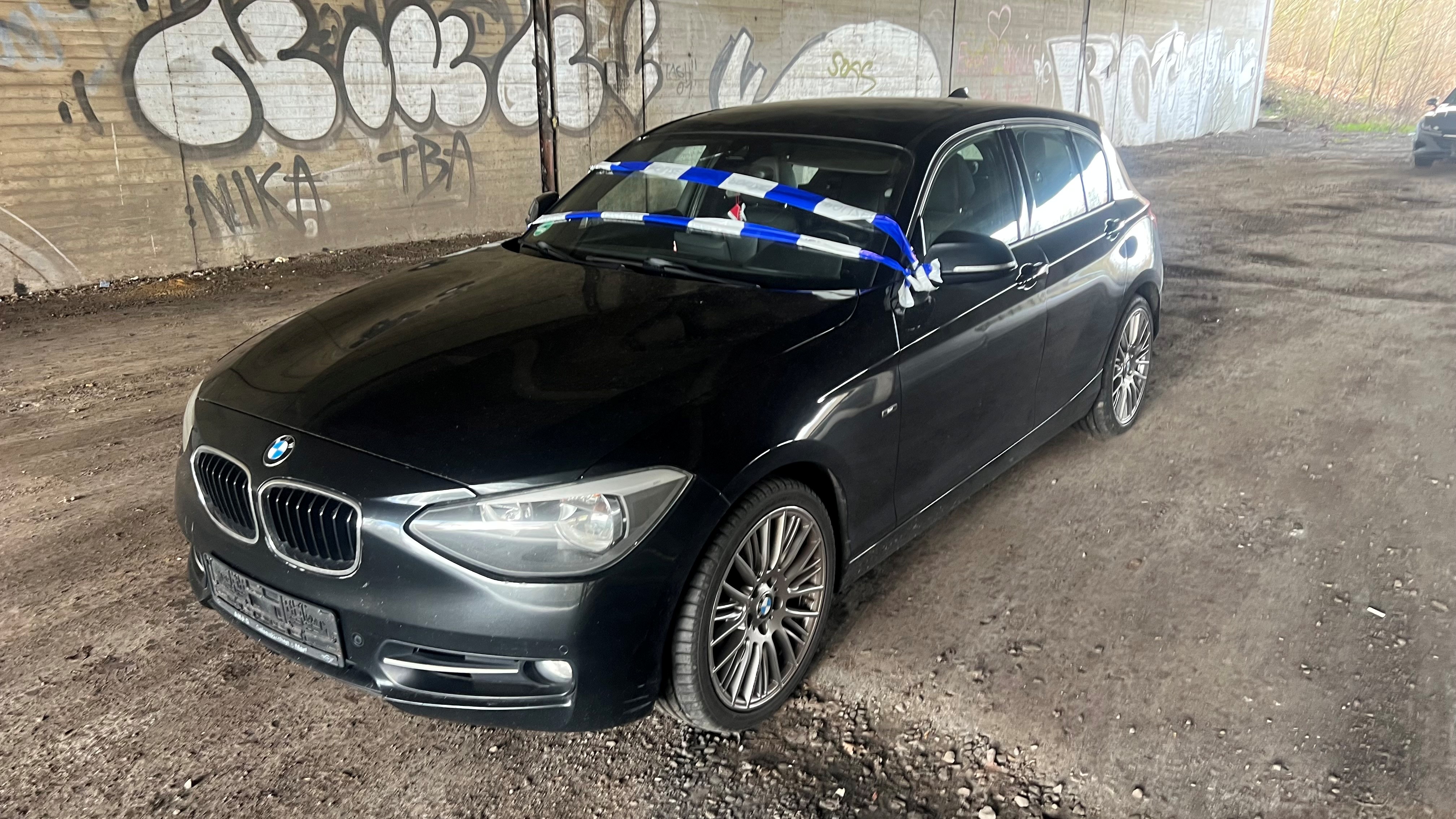 Bild: Dieser Einser-BMW steht aktuell ohne Kennzeichen am Nienburger Kaufland-Kreisel unter der B&-Ortsumgehung.