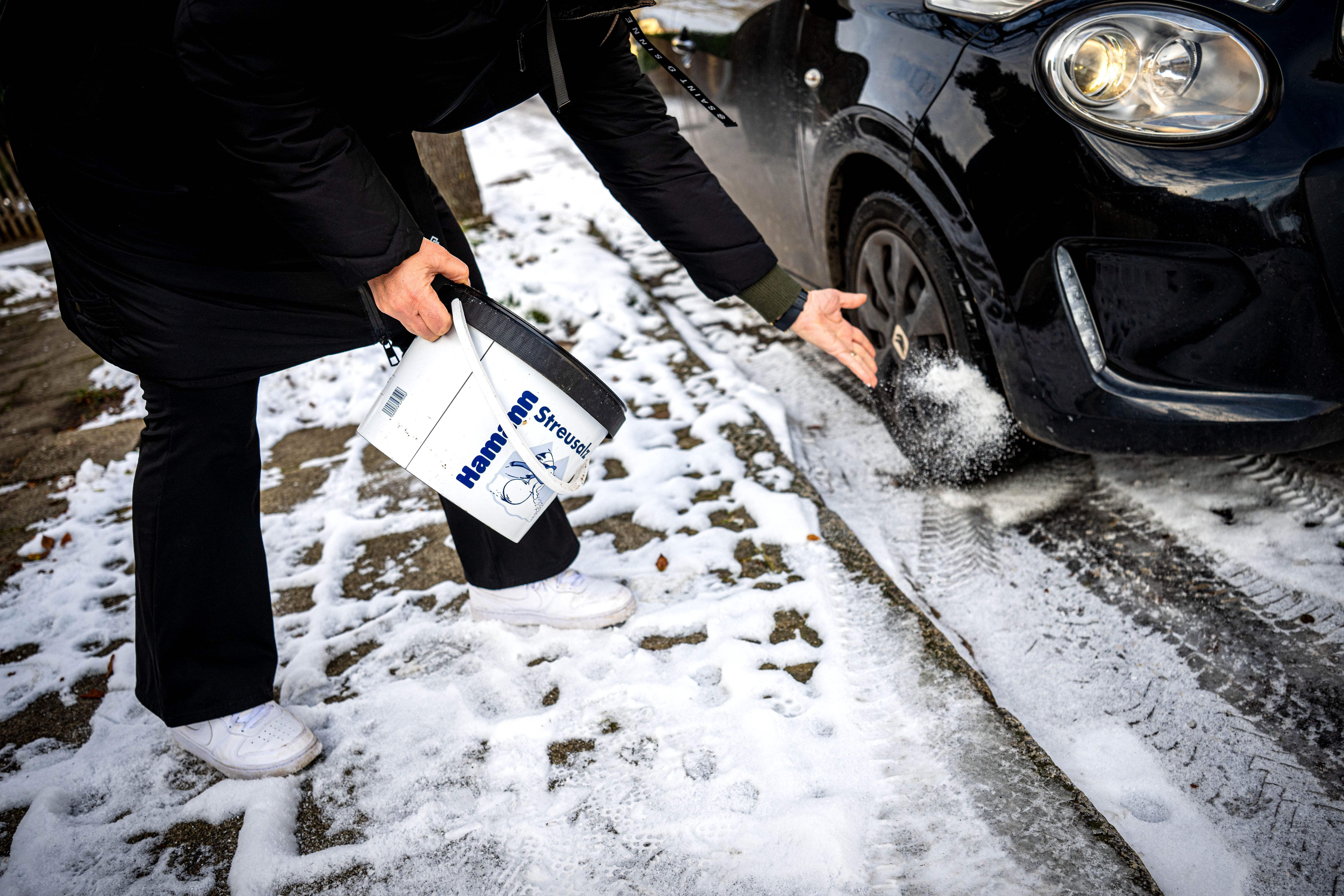 Bild: Eine Frau streut Salz vor ihr Auto, das wegen Glätte auf einer stark vereisten Straße feststeckt. (zu dpa: «Streusalzverbot aufgehoben – hohe Nachfrage in Baumärkten»)