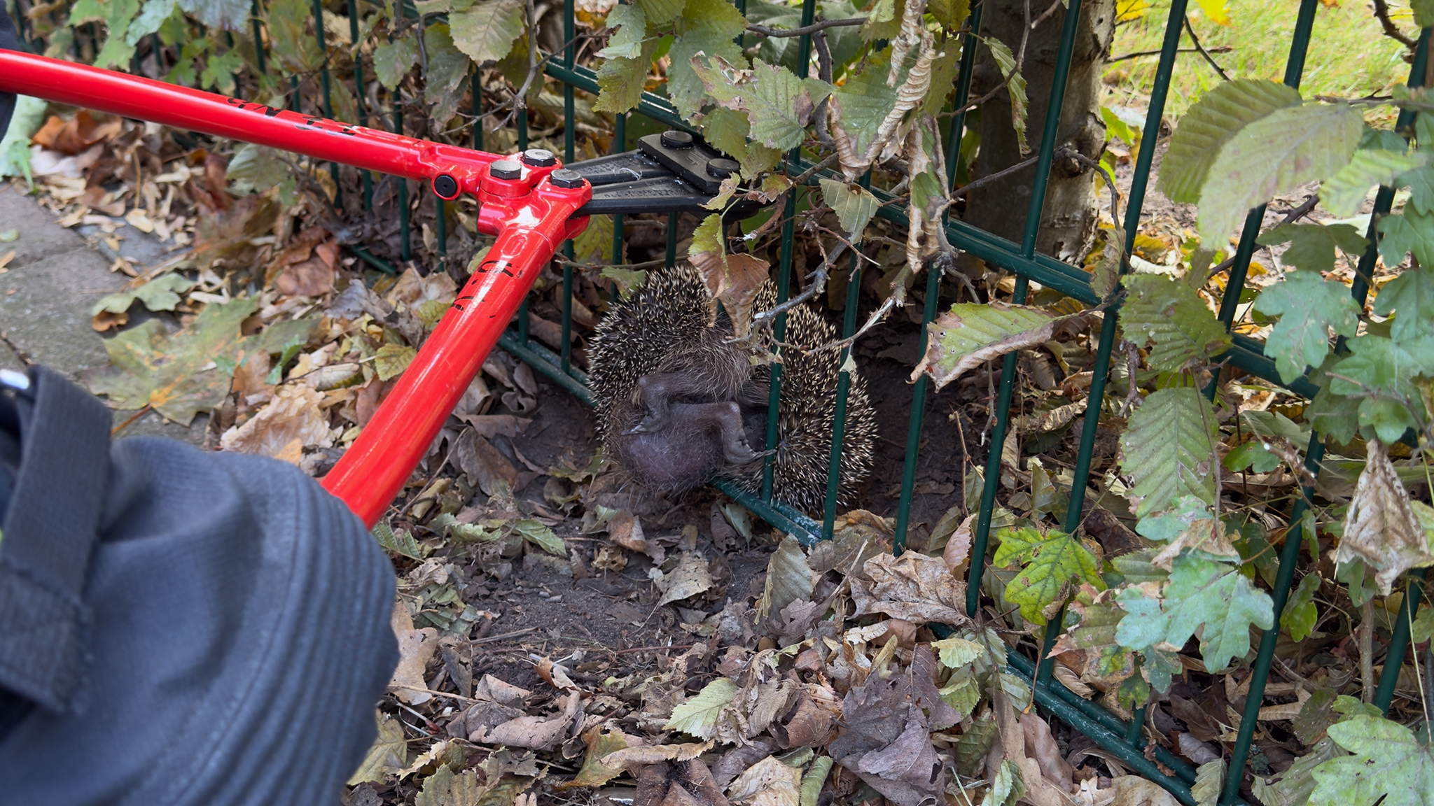 Bild: Mit einem Bolzenschneider musste die Feuerwehr den kleinen Igel aus seiner misslichen Lage befreien.