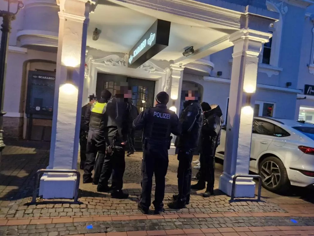 Bild: Mehrere Kräfte des Zolls und der Polizei stehen vor der Tür zum Scarabeo in Minden.