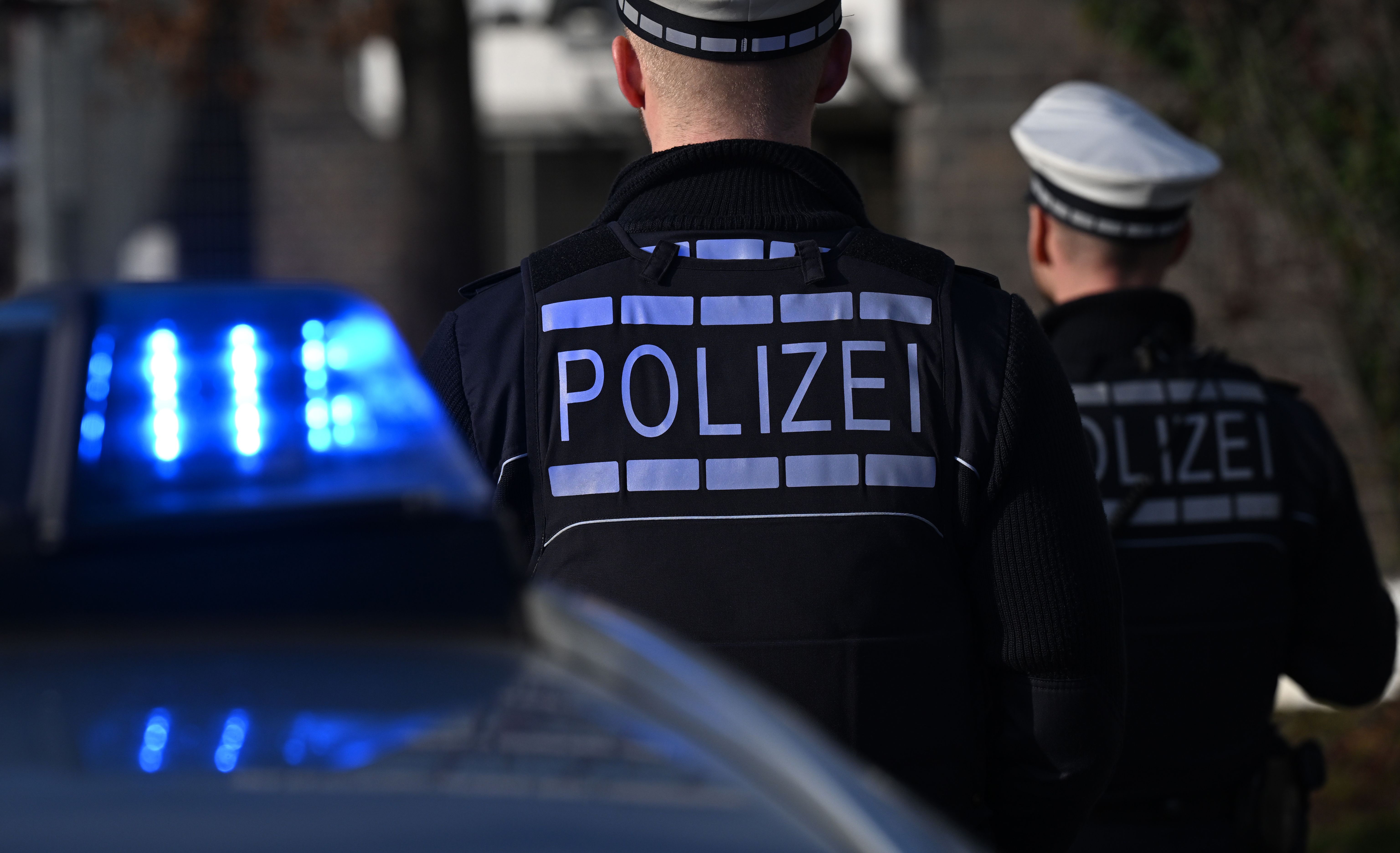 Bild: Das Logo der Polizei auf der Dienstkleidung von Polizisten die vor einem Blaulicht stehen (gestellte Szene). (zu dpa: «5.000 Menschen bei pro-kurdischer Demonstration in Frankfurt»)