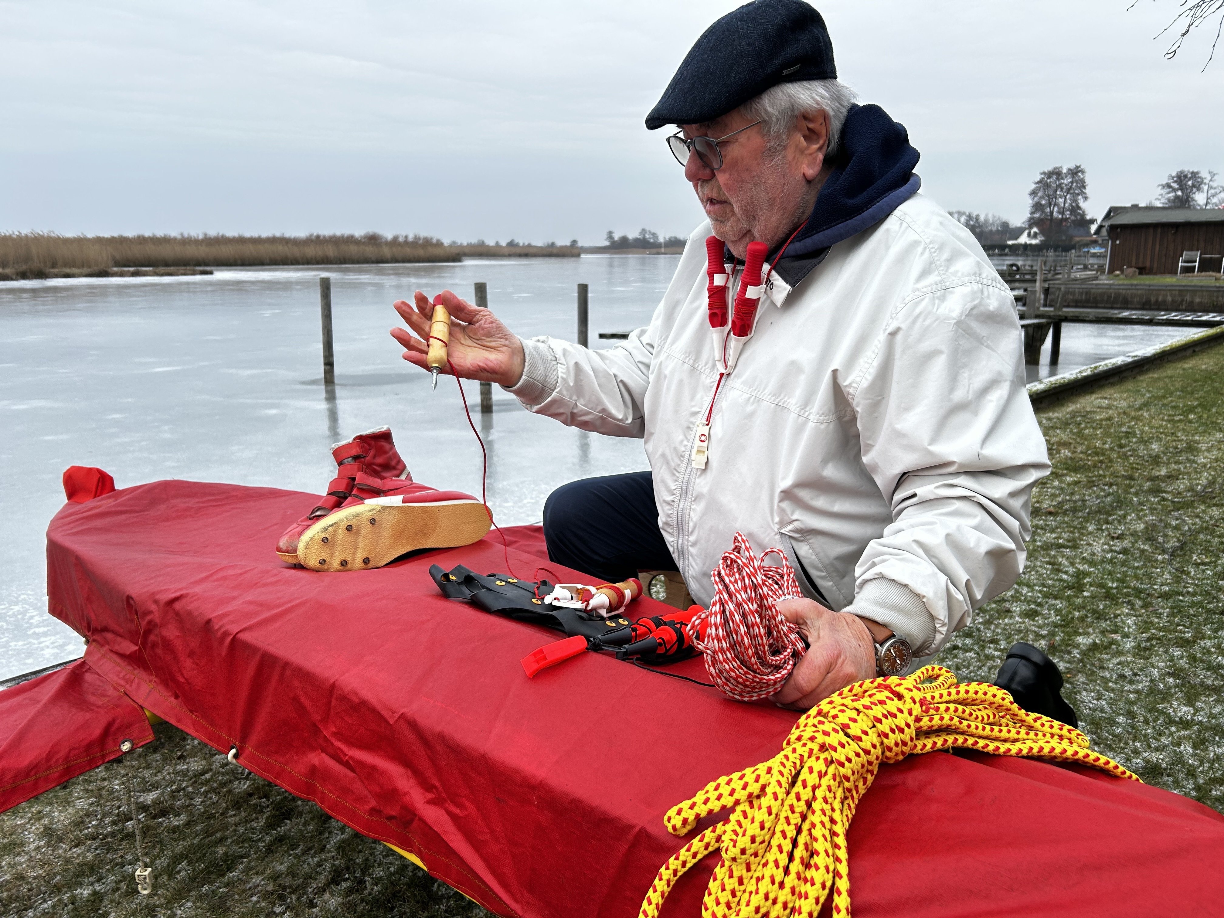 Bild: Der Steinhuder Emke Hilrichs zeigt die Rettungsmittel, die Eissegler immer dabei haben. Eine schwimmende Rettungsleine, Schuhe mit Spikes und Hansa-Dubben – das sind Eispickel, mit denen sich die Eissegler aus dem Wasser ziehen können, wenn sie einbrechen. Er empfiehlt sie auch Spaziergängern und Schlittschuhläufern.