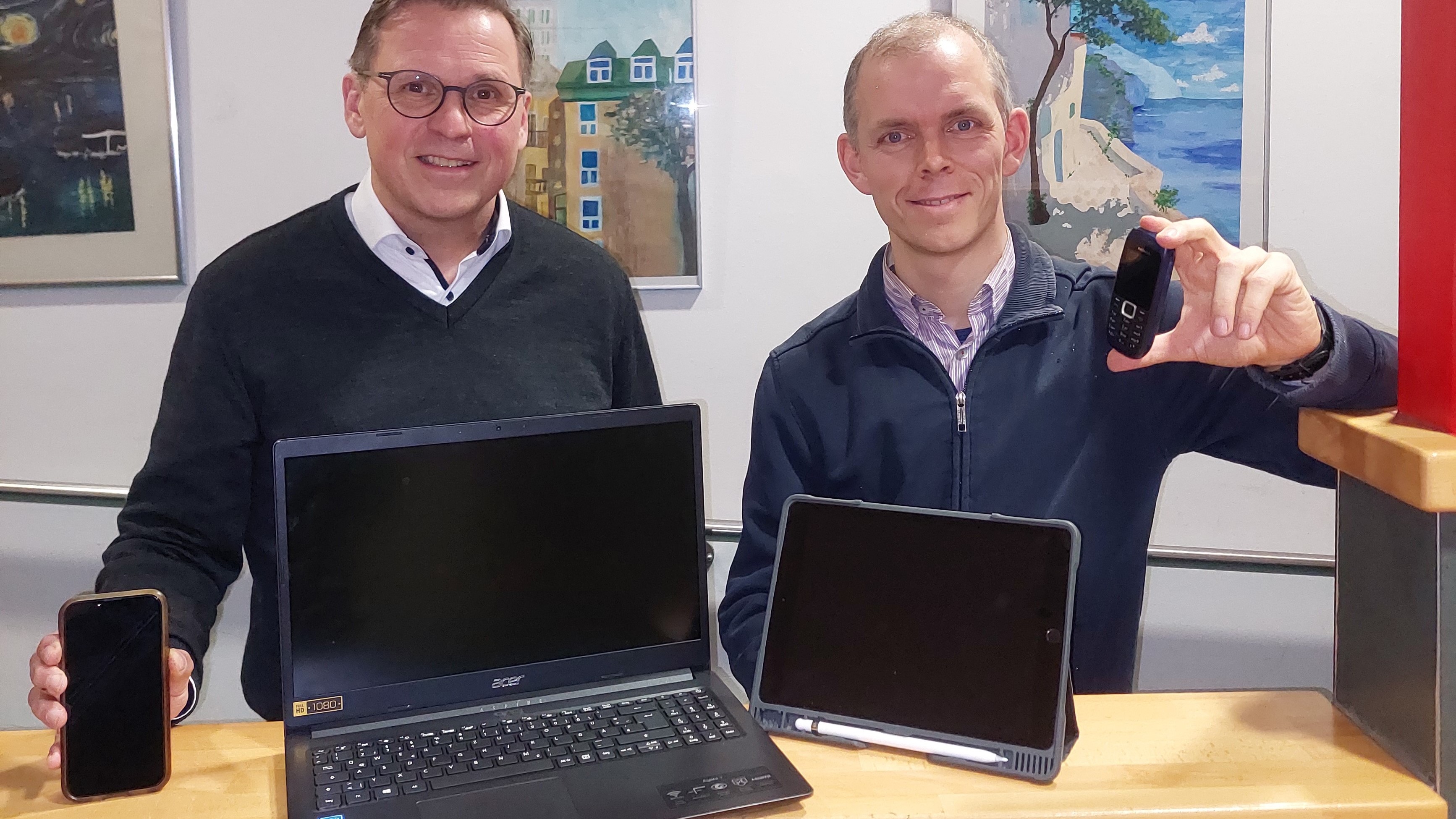 Bild: Schulleiter Lutz Kulze-Meyer und Initiator Andreas Finckh bewerben das neue Angebot der handyfreien Klasse.