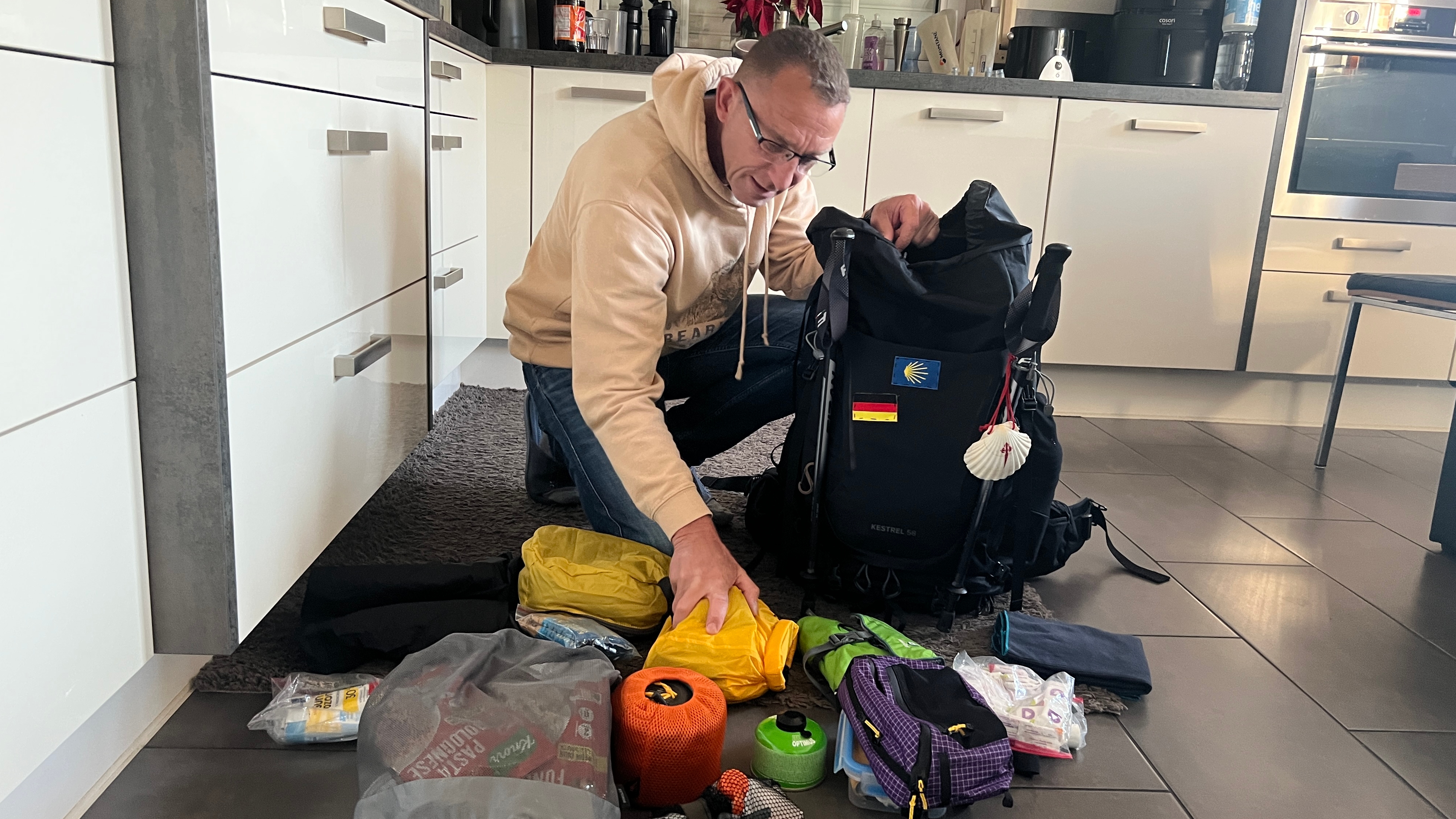 Bild: In der heimischen Küche: Der Steyerberger Marco Singer zeigt, was er in seinen Rucksack packt.