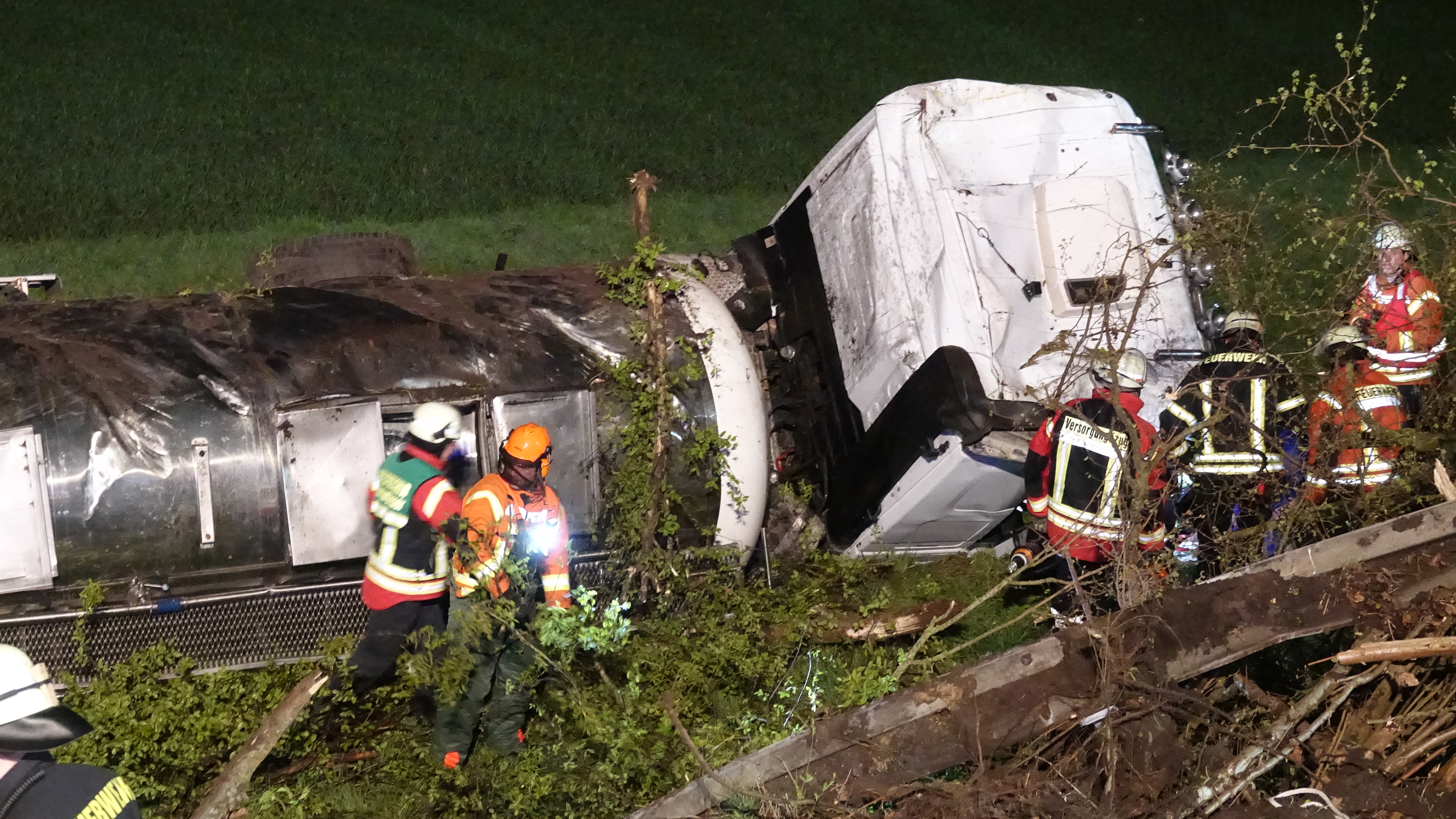 Bild: Ein mit Milch beladener Tanklastzug ist bei dem Unfall in einen Graben gestürzt.