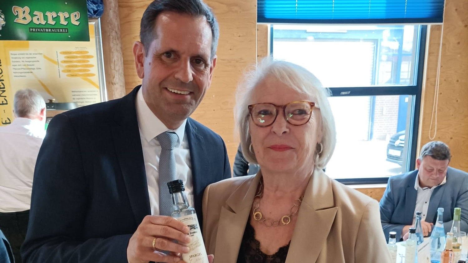 Bild: Eva-Maria Scheidler von der Eystruper Traditionsfirma Leman-Senf überreicht Niedersachsens Ministerpräsident Olaf Lies eine der ersten Flaschen des Spargelessigs.