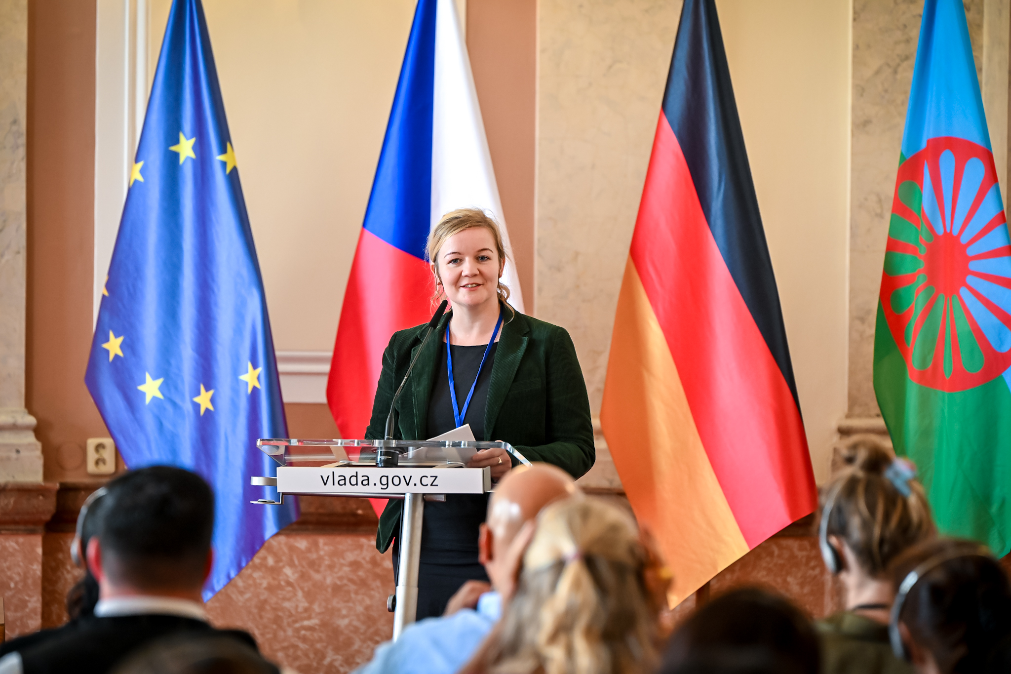 Bild: Verena Meier spricht bei der von ihr mitorganisiersten Konferenz "Das Erbe der überlebenden Sinti und Roma über Generationen hinweg. Anerkennung, Verantwortung und Herausforderungen 80 Jahre nach dem Zweiten Weltkrieg" in der Straka-Akademie im September 2025 in Prag.