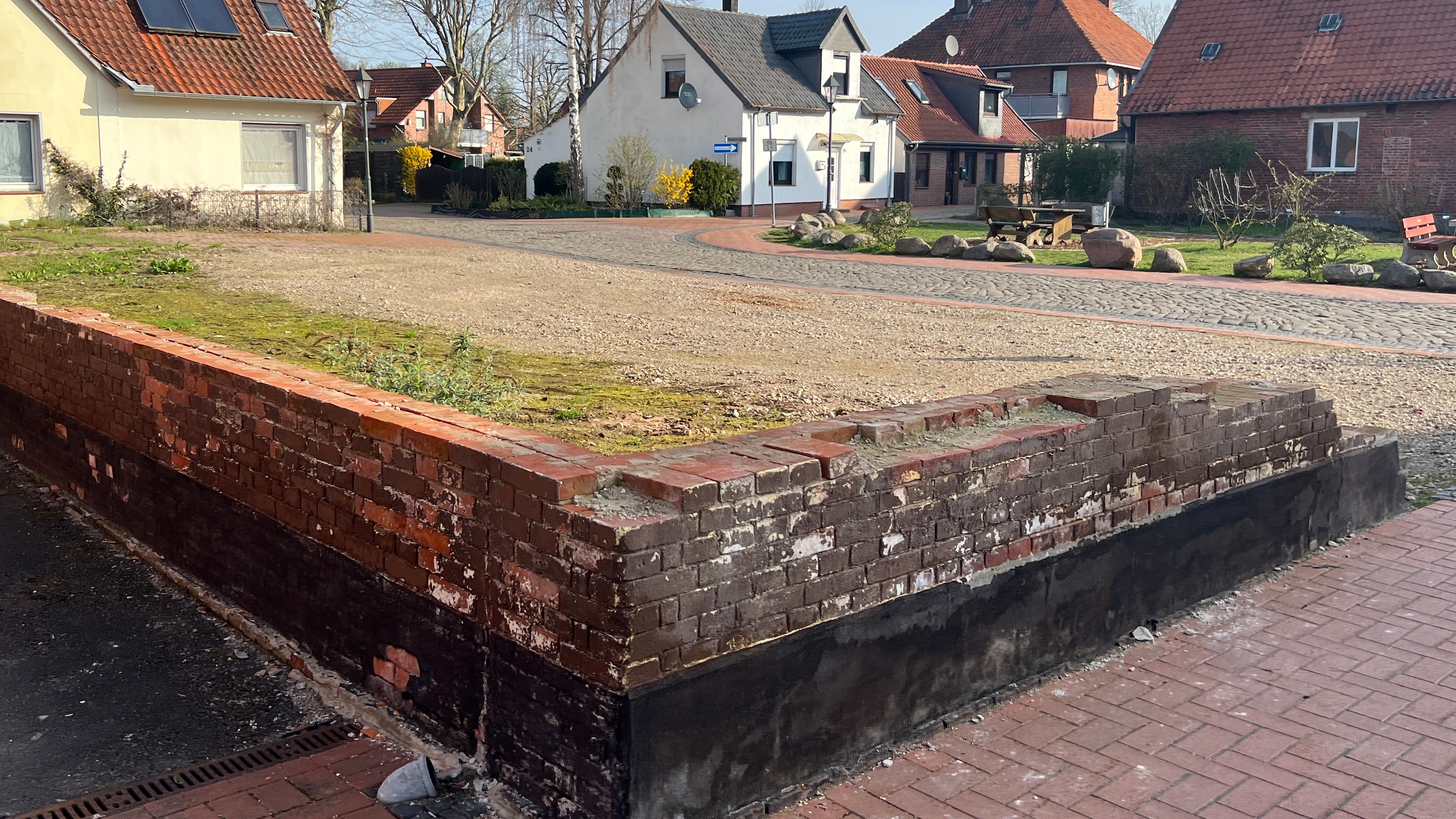 Bild: Diese Freifläche an der Hohe Straße/Hinterm Dahle in Stolzenau wird neu gestaltet. Das Mauerwerk eines Brandhauses ist ein Bestandteil.