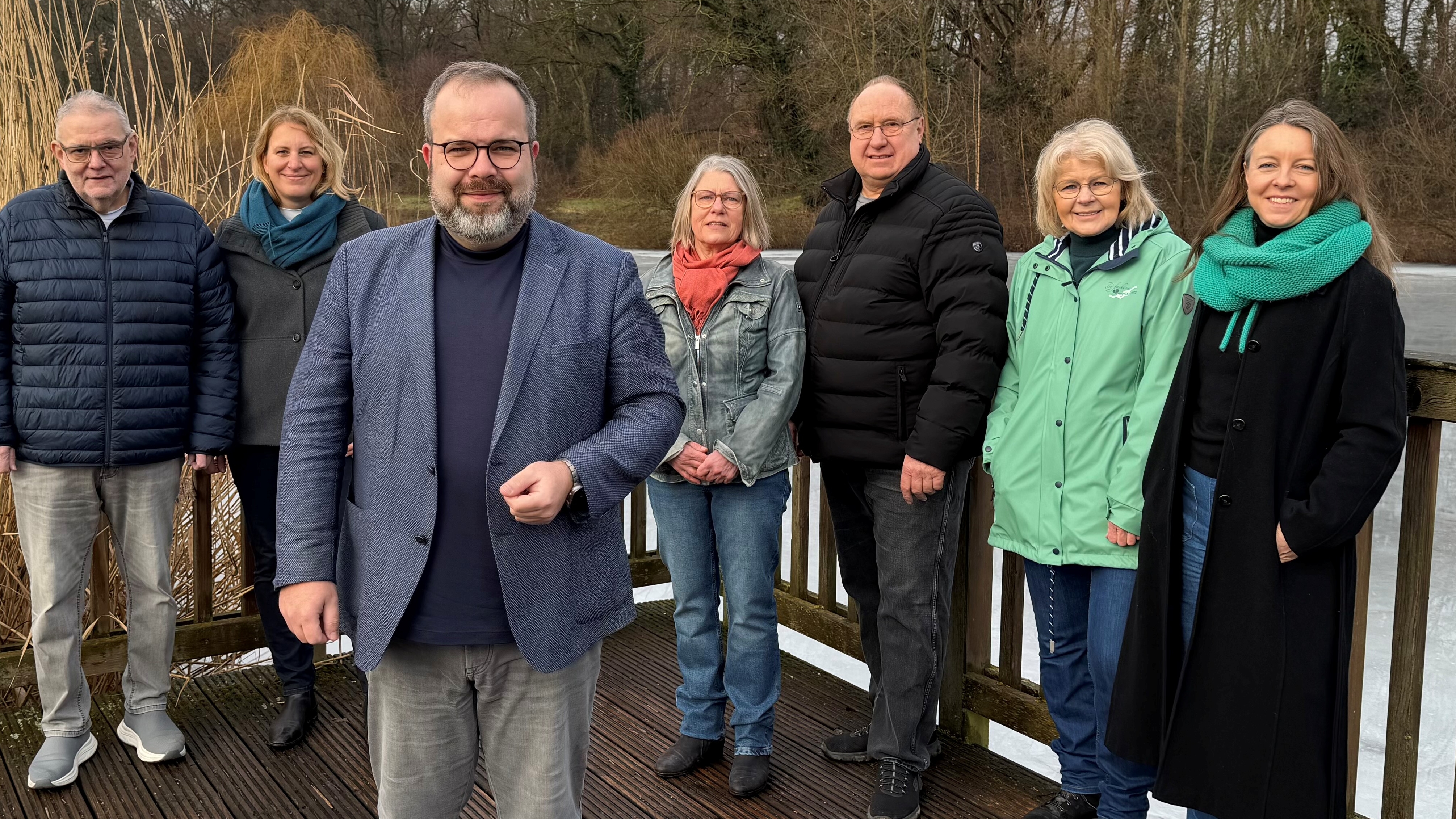 Bild: Sie unterstützen die Kandidatur von Cord Steinbrecher (Vordergrund) (v.ln.r.: Norbert Richter und Dr. Tina Dettmer (WG), Ulrike Wanner und Norbert Sommerfeld (SPD) sowie Margit Datan und Elisabeth Jacobs (Grüne)