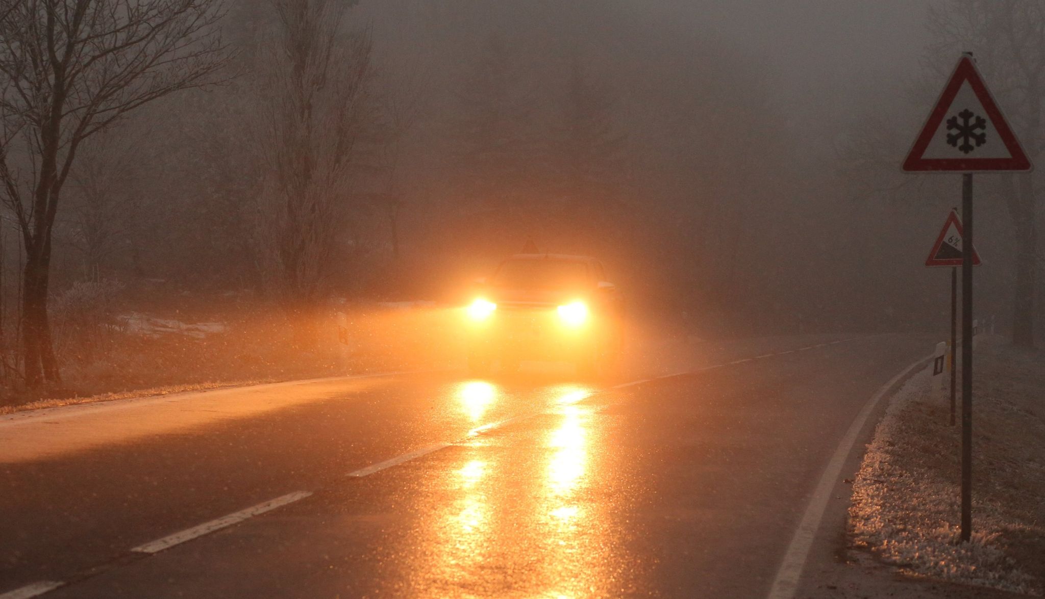 Bild: Ein Auto fährt bei Glatteis und Nebel über eine Straße.