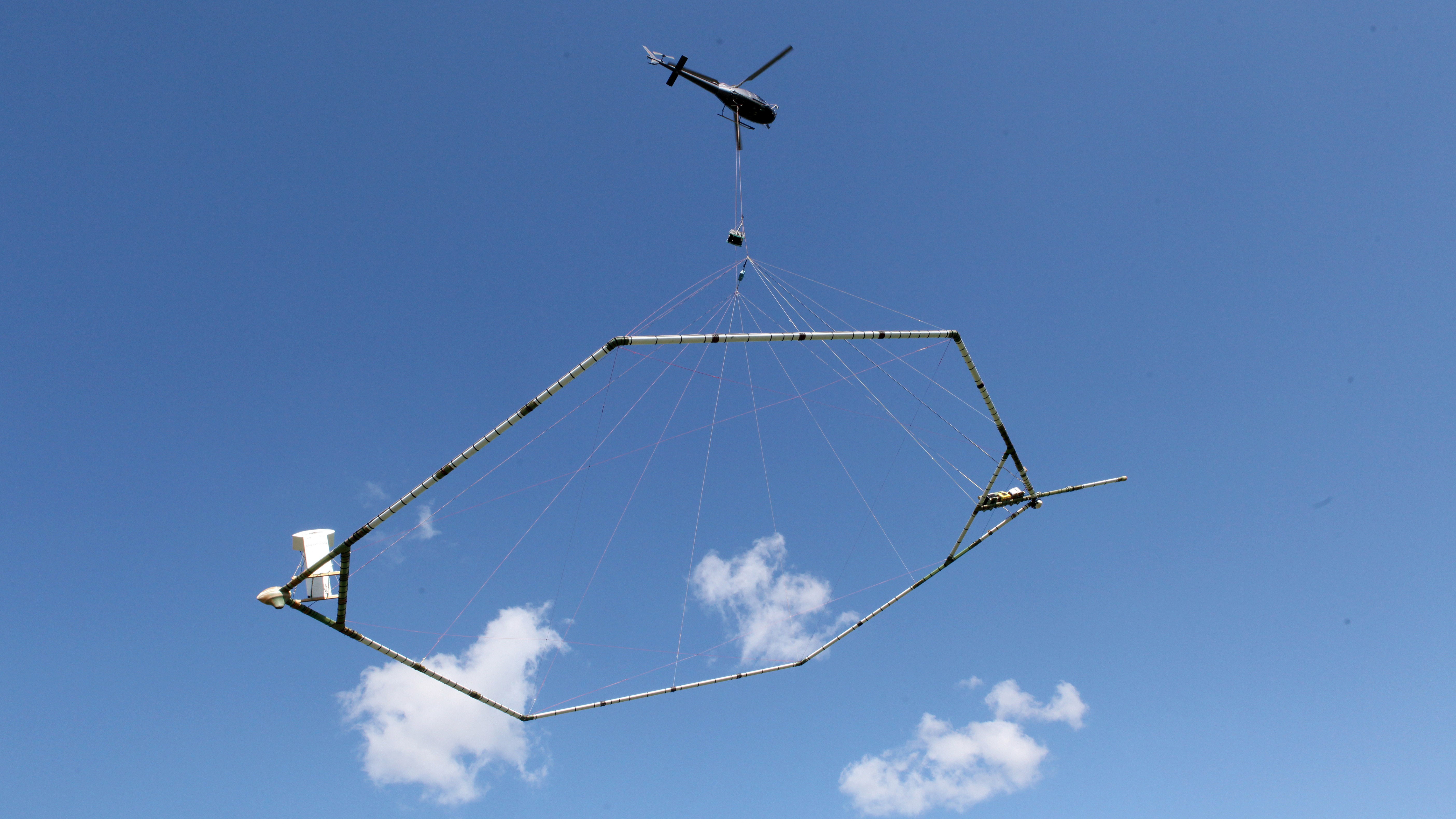 Bild: Bei SkyTEM-Befliegungen schleppt ein Hubschrauber in rund 30 Metern Höhe eine Antenne über die Geländeoberfläche.