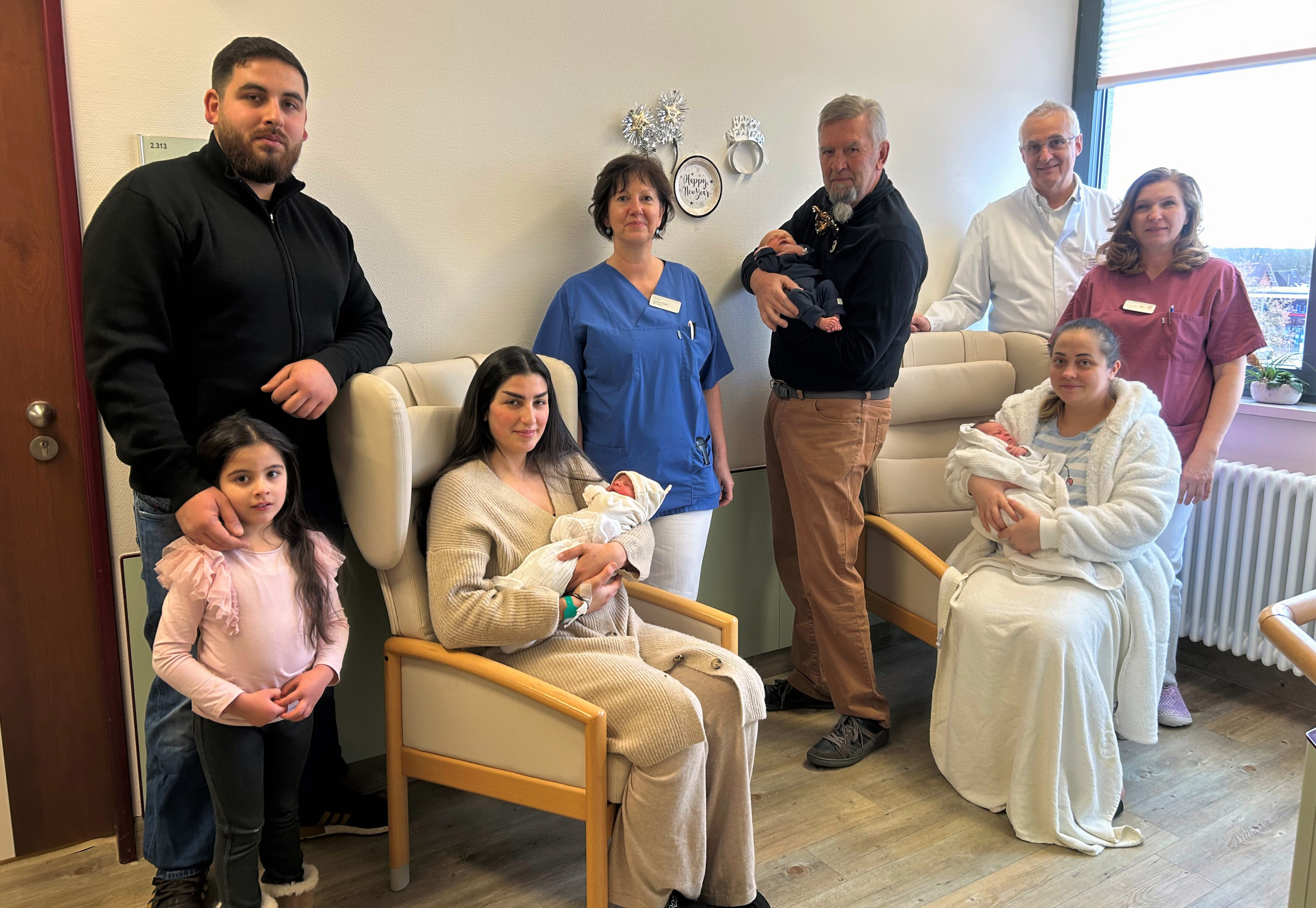 Bild: Vater Ismet mit Mehdiya, Mutter Kadije mit Baby Medina, Stationsleitung Ina Ückert, Großvater Wolfgang mit Silvesterbaby Joris, Chefarzt Dr. Mathias Uhlig, Mutter Alexandrina mit Otilia und Hebamme Natalia Moor freuen sich über die Geburten.