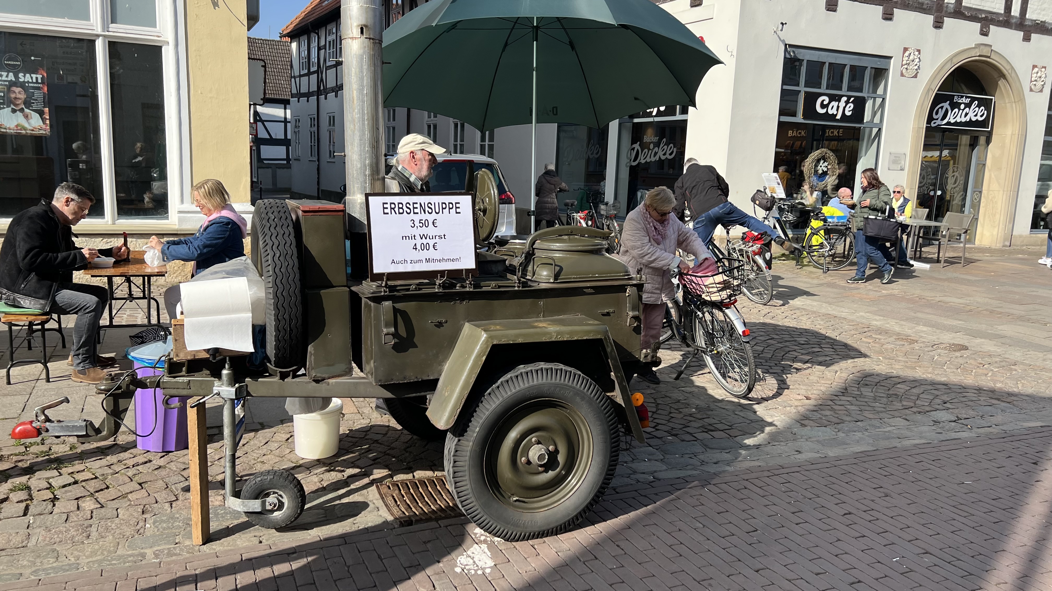 Rätselraten auf dem Nienburger Wochenmarkt: Wo ist Rolf Sturzmann mit seiner Erbsensuppe aus der Feldküche geblieben? (💶)