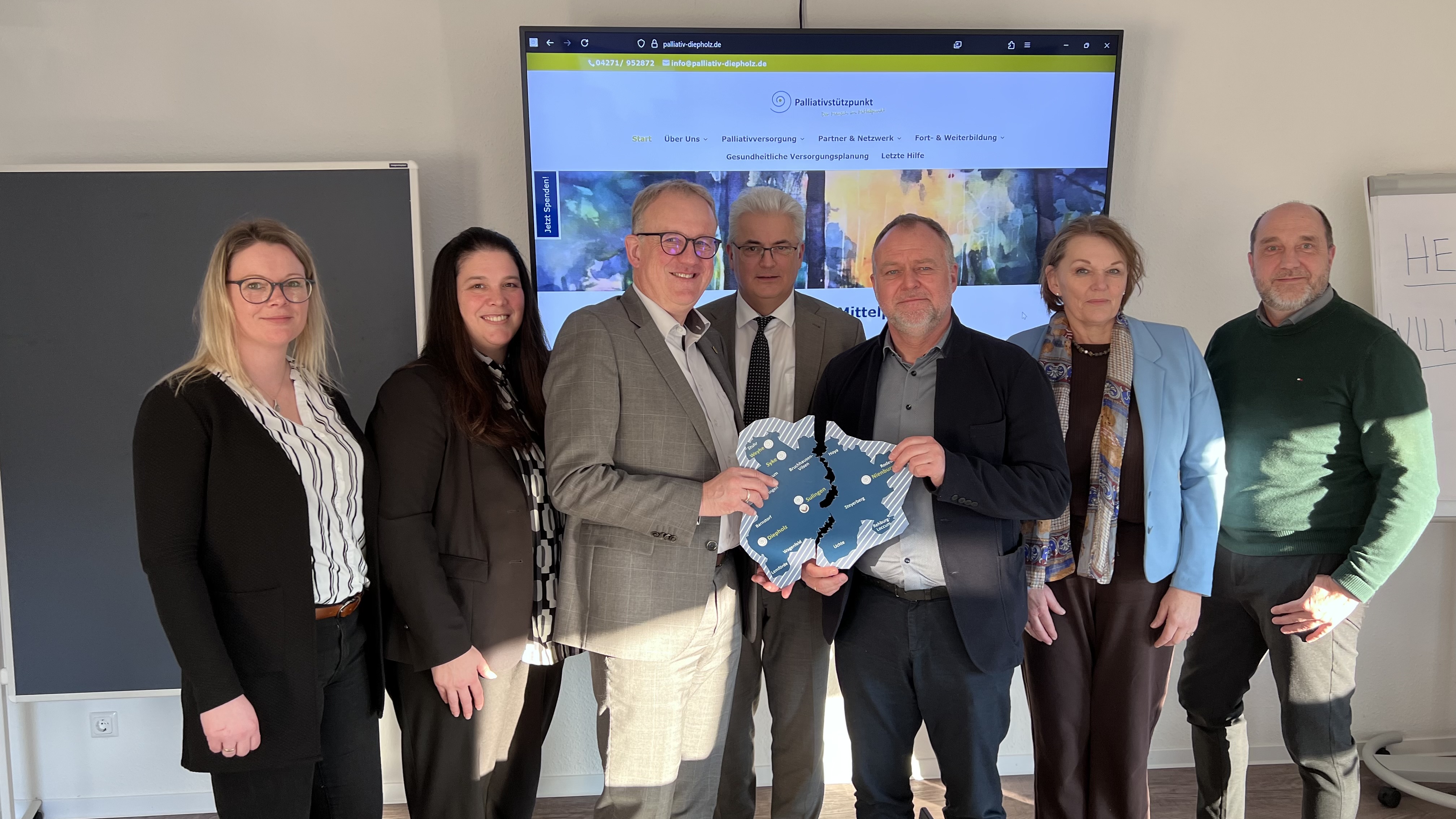 Bild: Versprechen sich eine bestmögliche Palliativ-Versorgung für die Kreise Nienburg und Diepholz (von links): Sarah Pggenburg und Bianca Sengün (Palliativstützpunkt), Volker Meyer (Landrat Diepholz), Bundestagsabgeordneter Axel Knoerig, Detlev Kohlmeier (Landrat Nienburg), Karola Holweg und Stefan Siegel (Palliativstützpunkt). Mechthild Schmithüsen fehlt auf dem Bild.