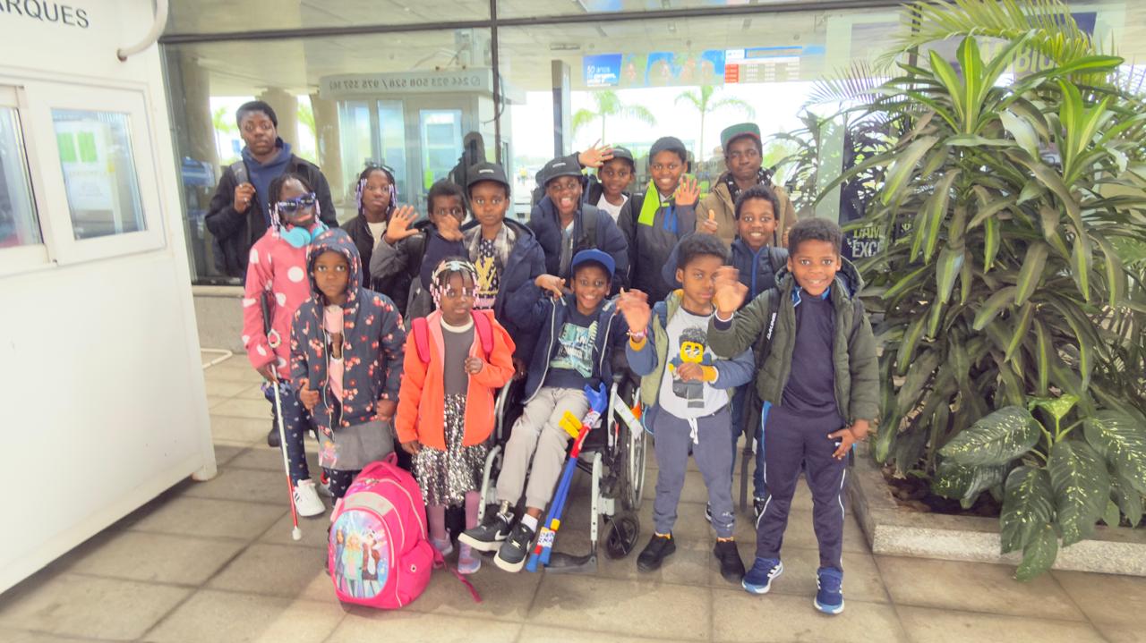 Bild: Manuel (im Rollstuhl) mit anderen angolanischen Kindern aus dem Friedensdorf International bei seiner Ankunft in Nienburg.