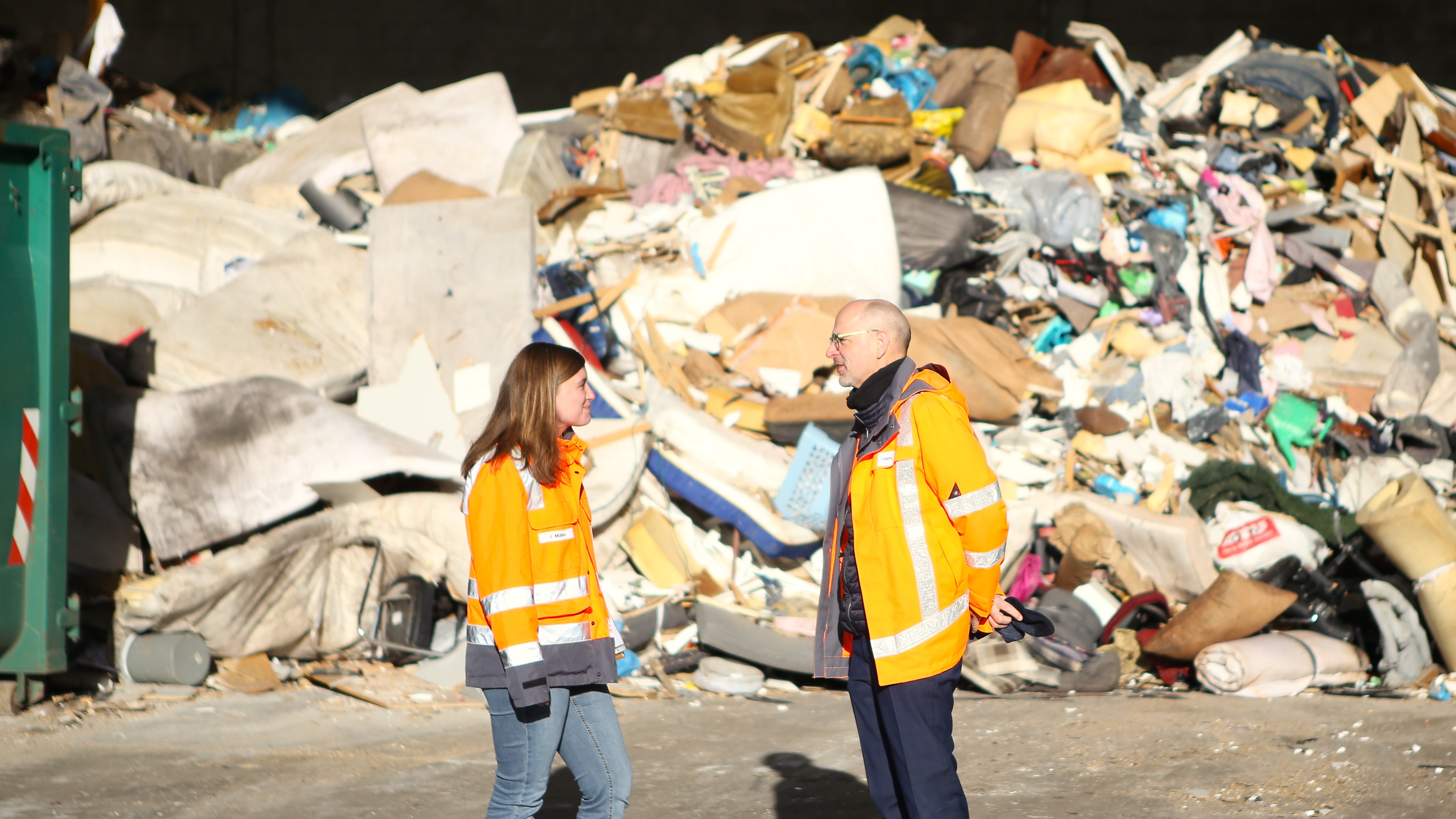 Bild: BAWN-Vorstand Arne Henrik Meyer im Gespräch mit Unternehmenssprecherin Johanna Müller vor einem Berg aus Sperrmüll.