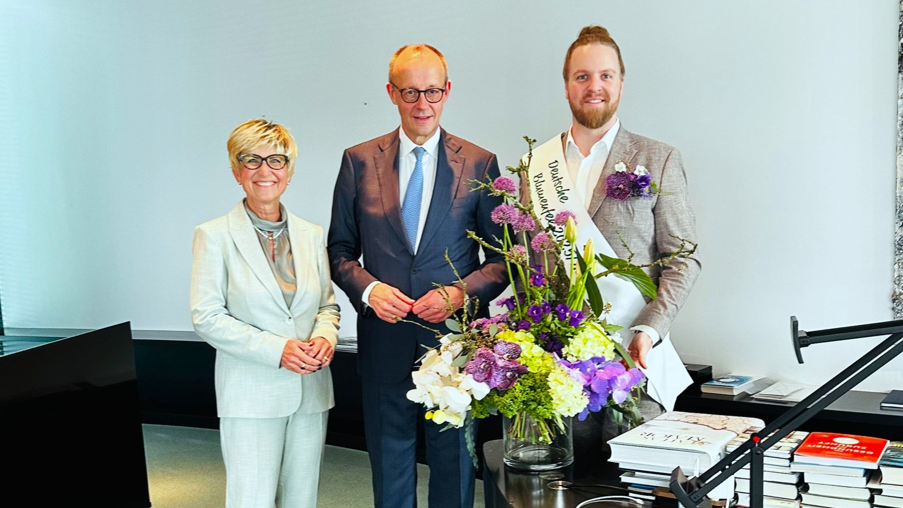 „Oh mein Gott, ich treffe den Bundeskanzler“ – Hannes Schrader überreicht Merz einen Strauß