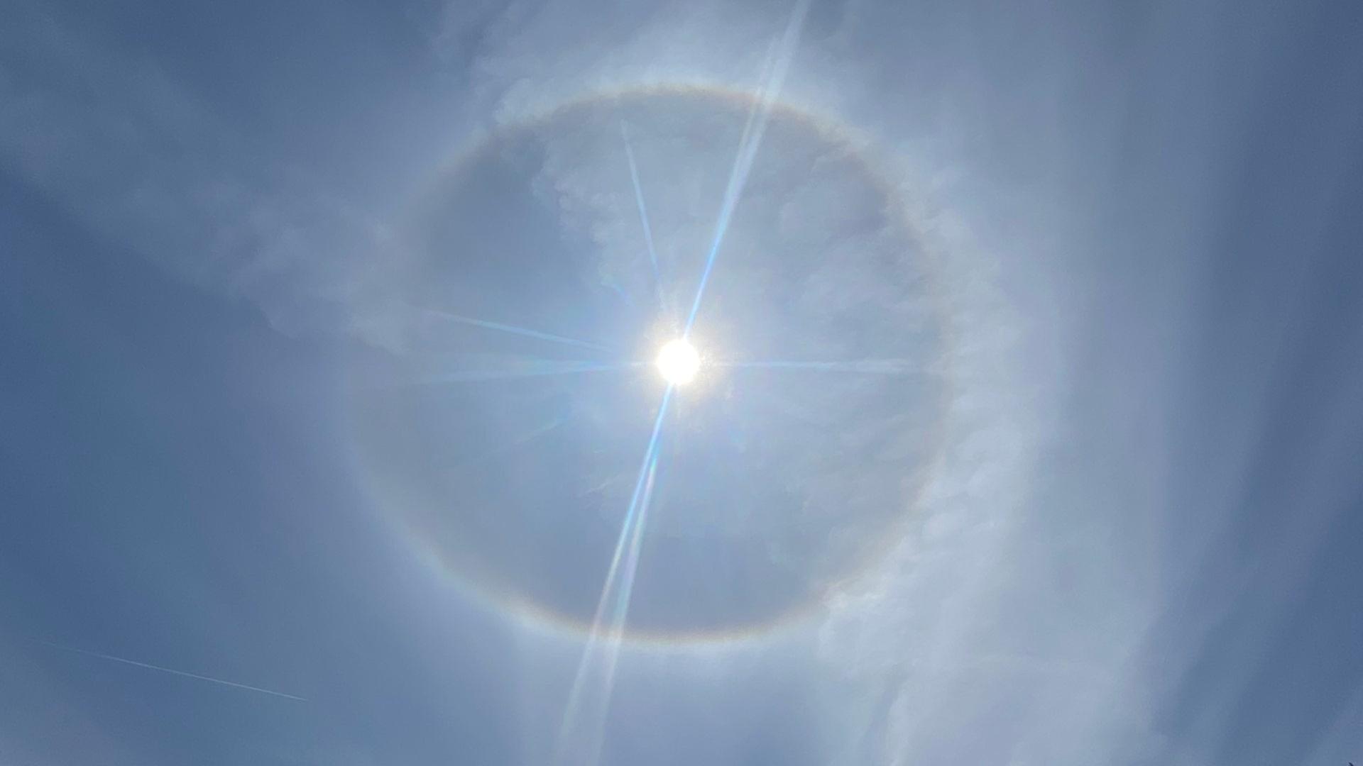 Bild: Ein Kreis aus Licht umspielt die hoch am Himmel stehende Sonne