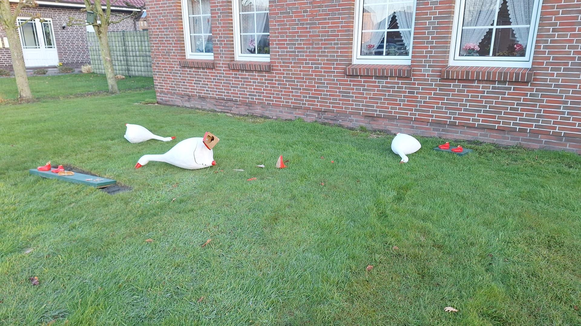 Bild: Abgebrochene Gänse-Plastikfiguren liegen auf dem Rasen.