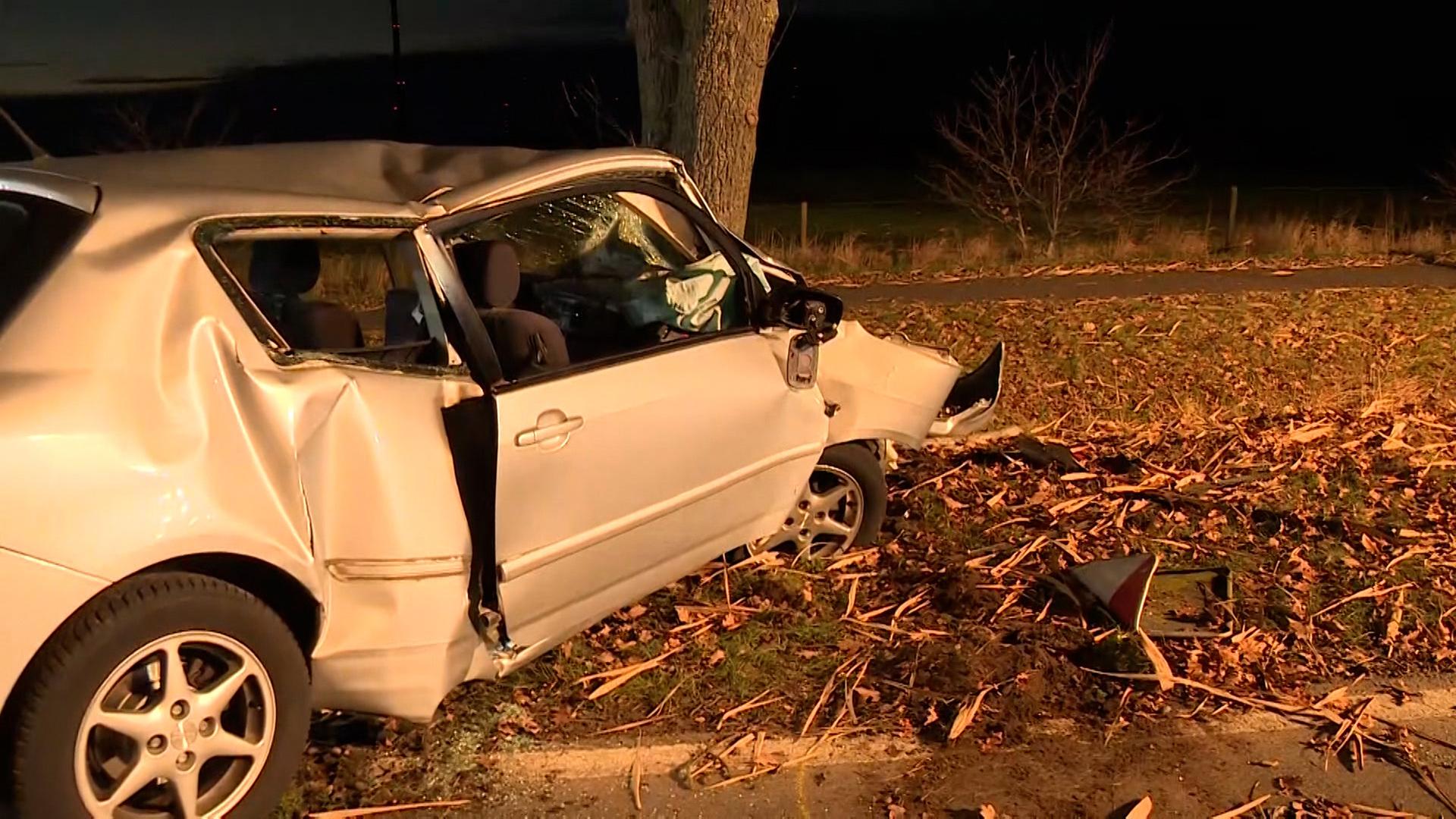 Bild: Ein Auto steht nach einem Unfall an einem Baum.