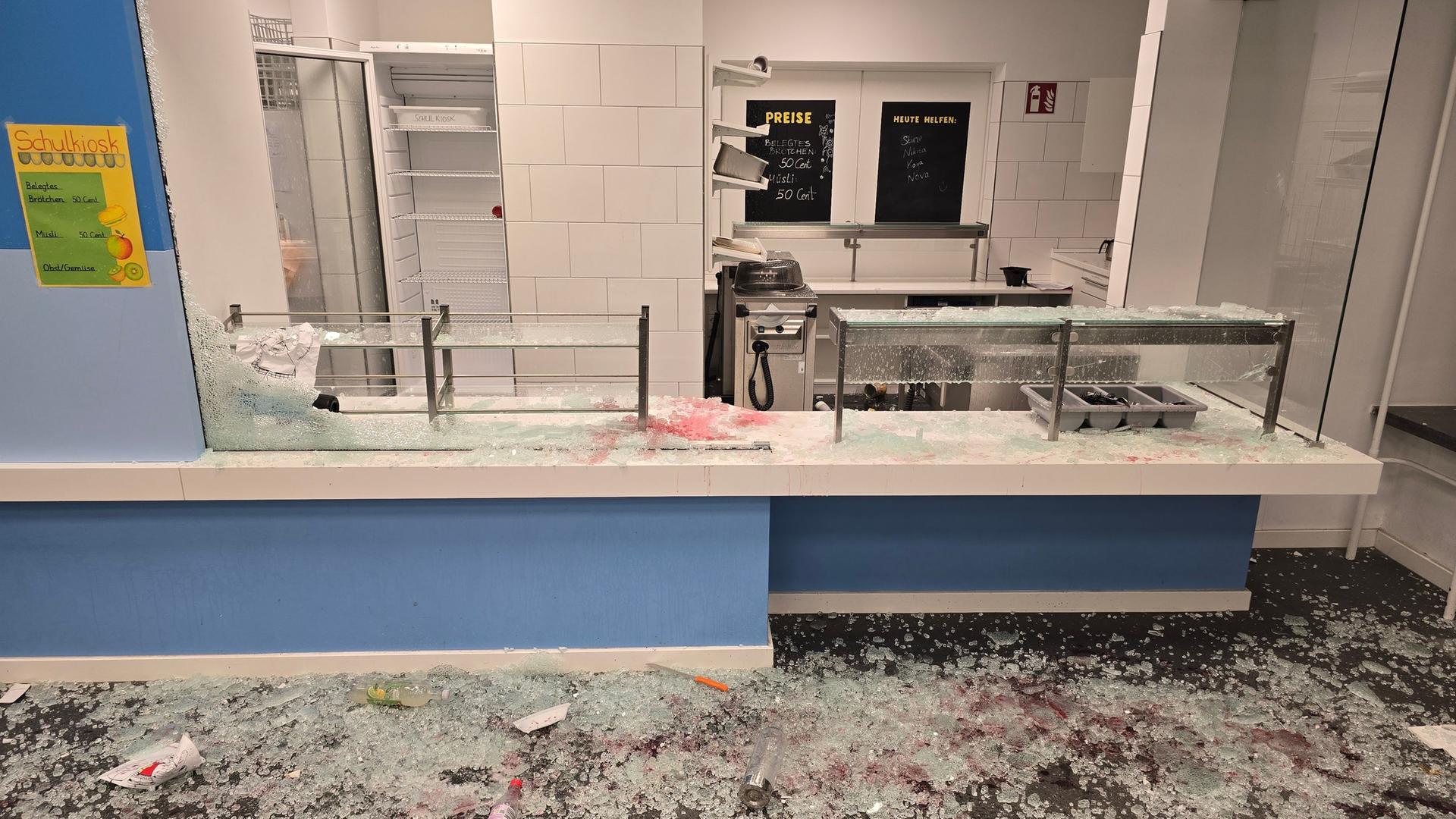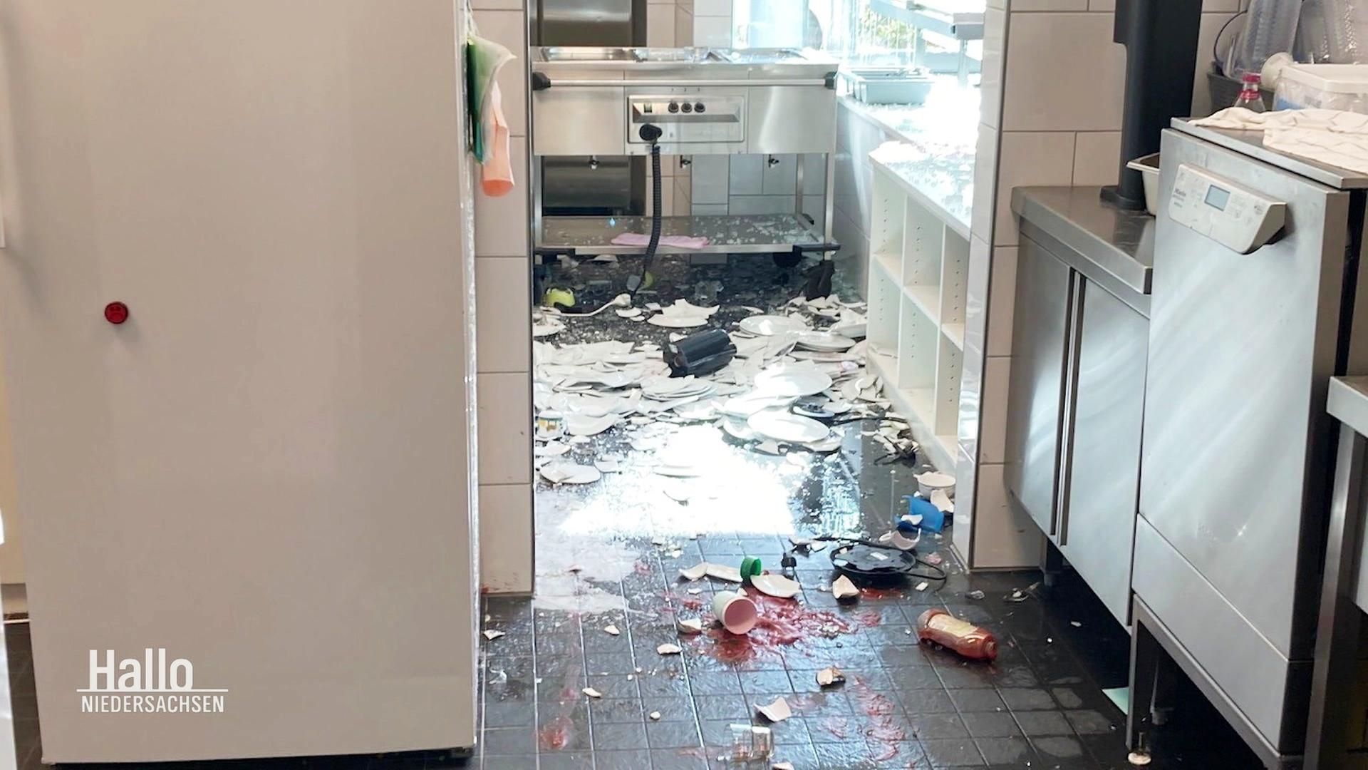 Bild: Blick in die verwüstete Schulküche mit zerbrochenem Geschirr auf dem Boden.