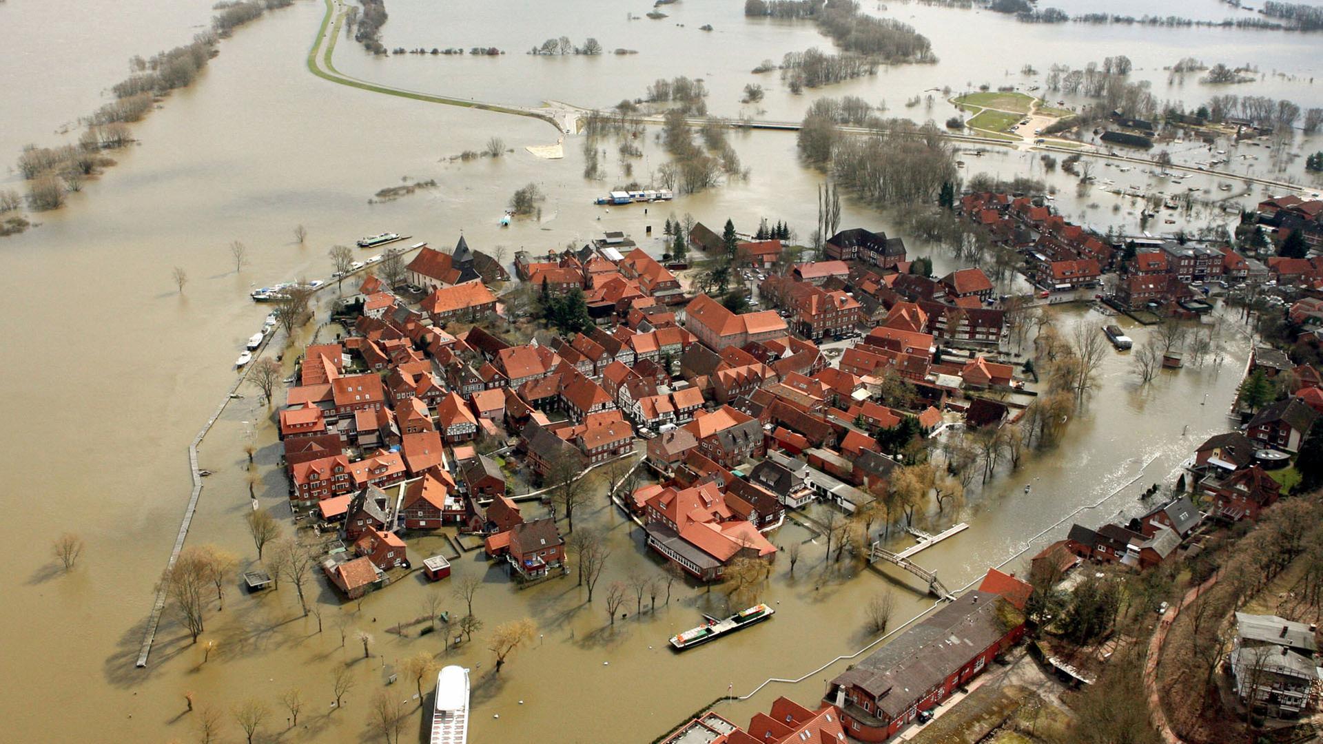 Bild: Luftaufnahme der überfluteten Altstadt von Hitzacker am 6. April 2006