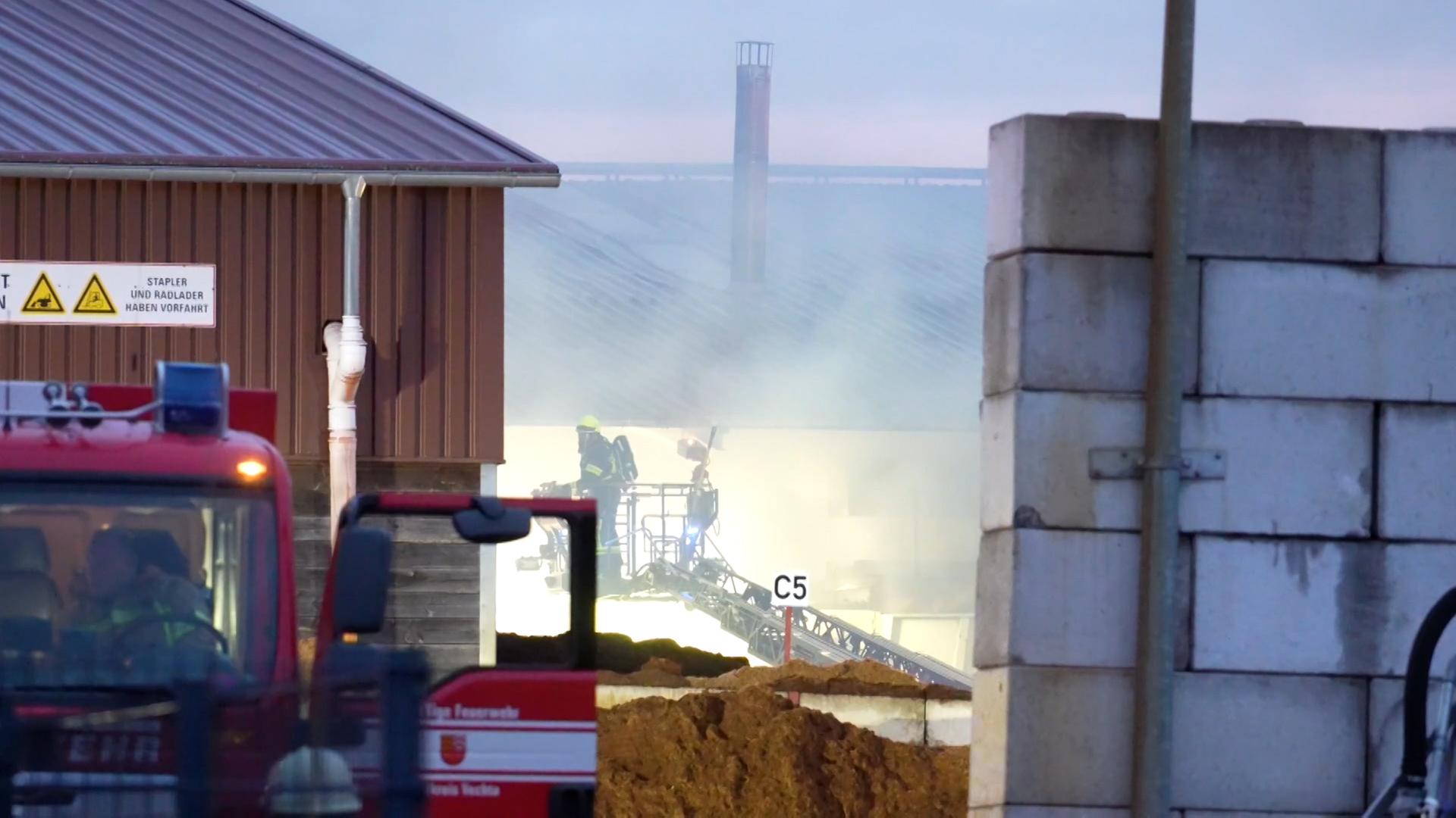 Bild: Feuerwehrleute löschen ein Brand in einem torfverarbeitenden Betrieb in Vechta.