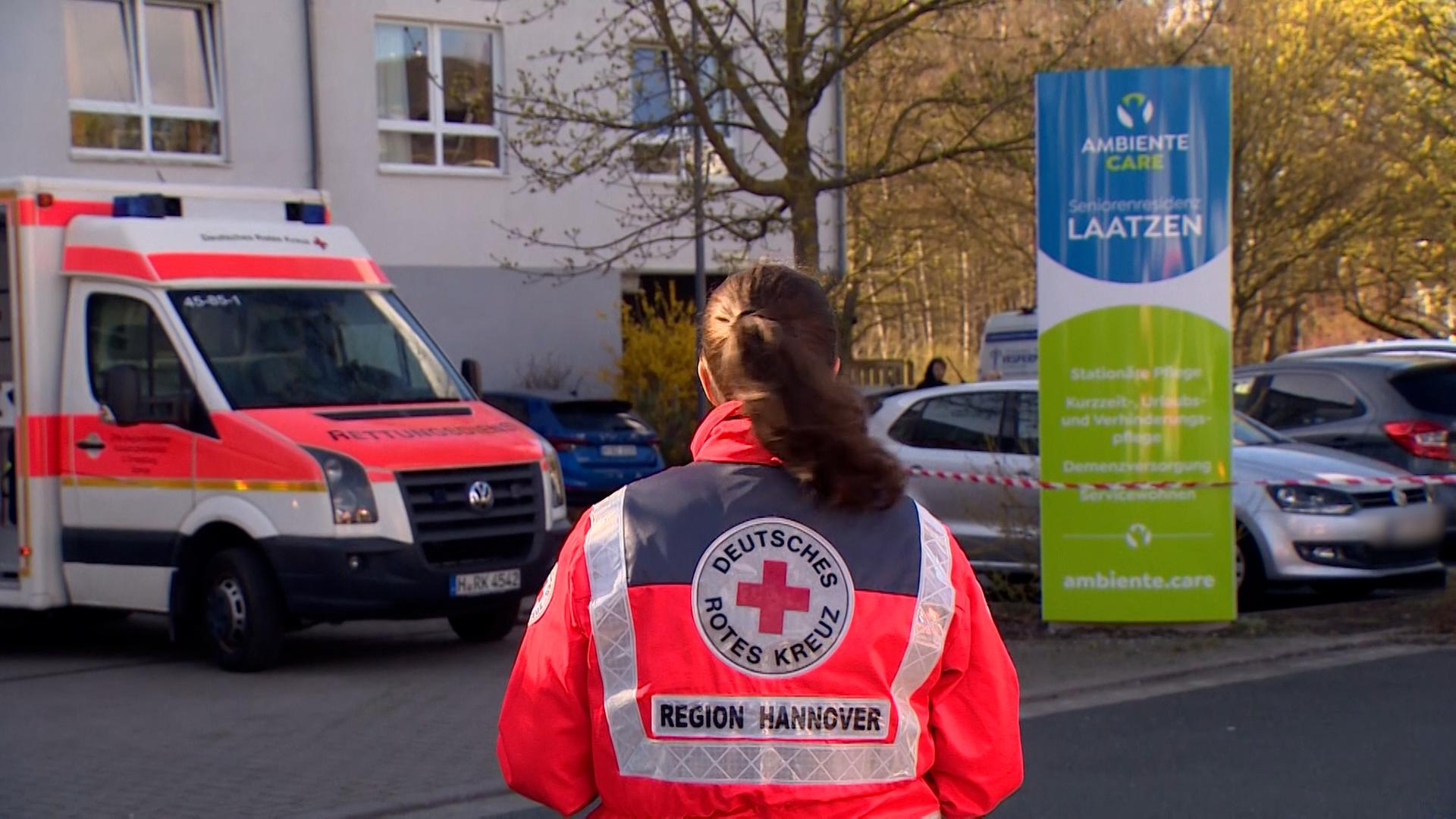 Bild: Eine Mitarbeiterin des DRK steht vor einem Pflegeheim in Laatzen.