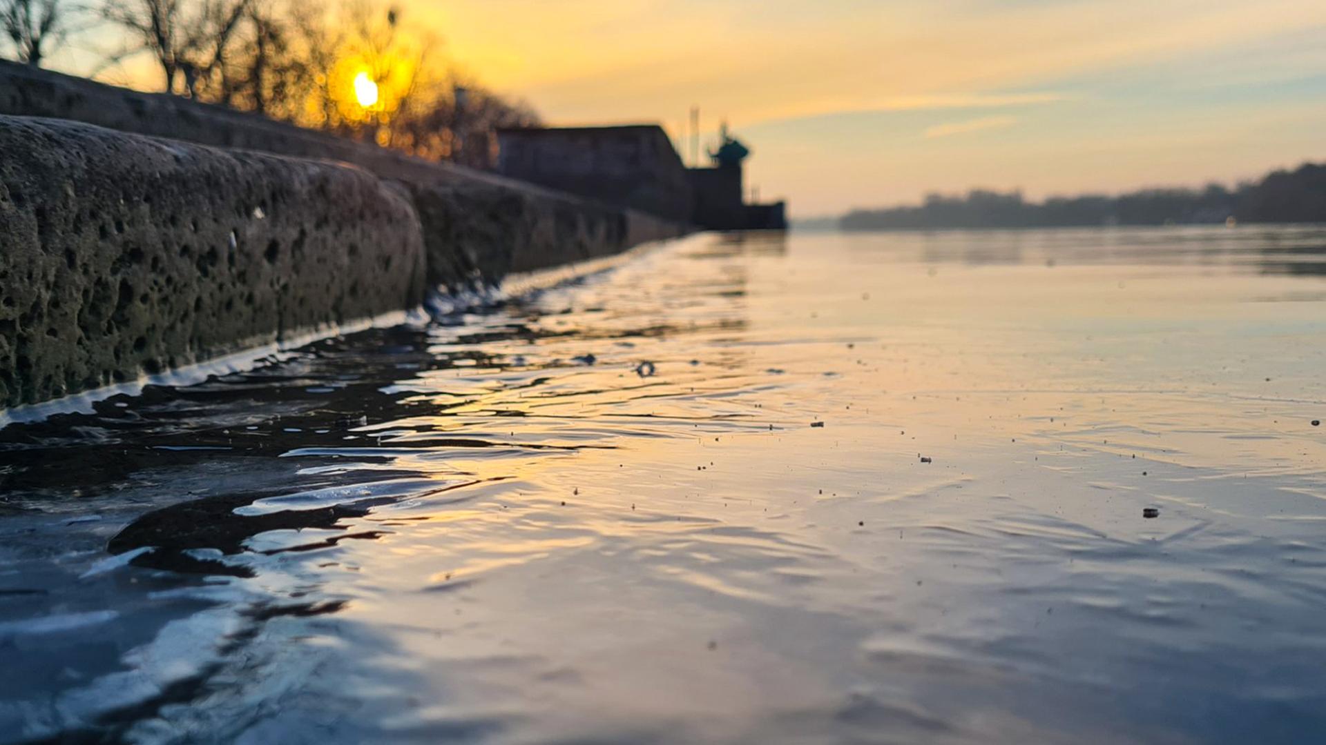 Bild: Unberührte Eisschicht auf dem Maschsee Hannover bei Sonnenaufgang.